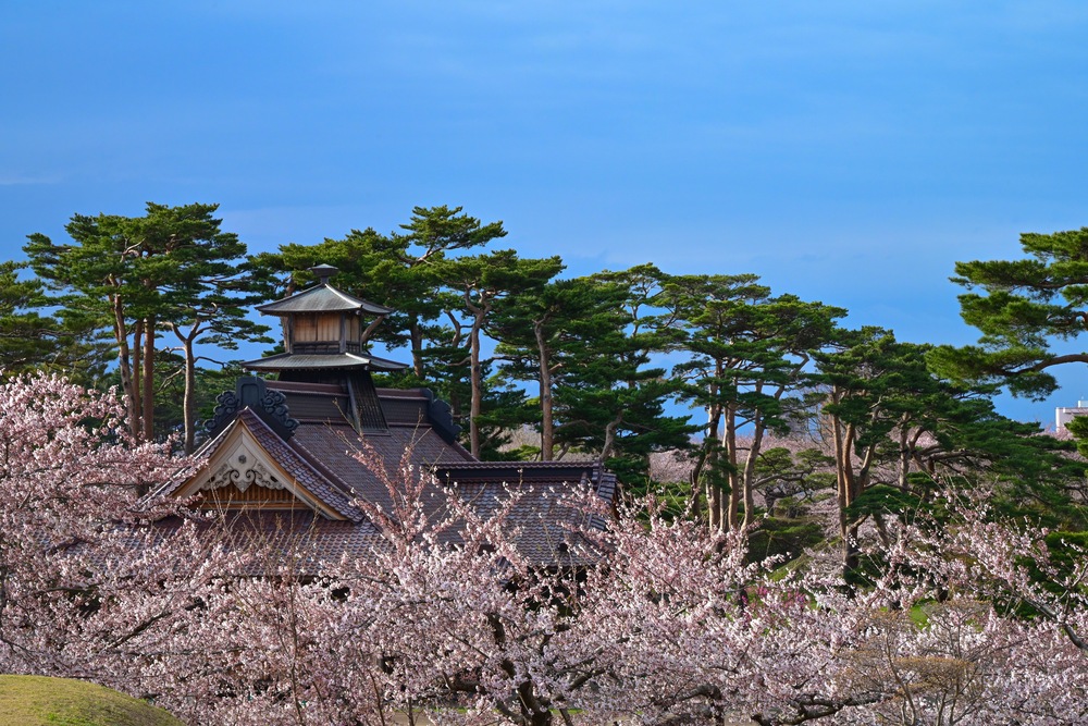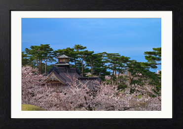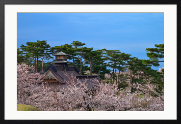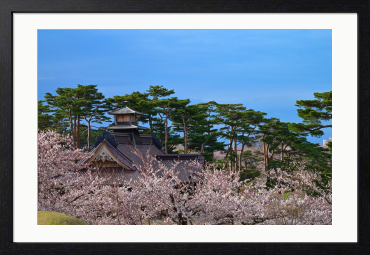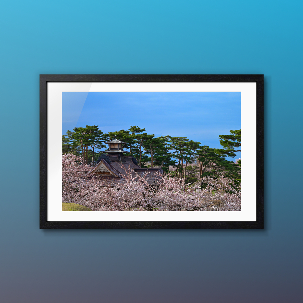春の光に包まれた、静かな日本の原風景。 満開の桜の奥に佇むのは、時を重ねてきた歴史ある建築と、凛と立つ松の木々。 淡い花色と深い緑、澄んだ青空が織りなす調和は、見る人の心に穏やかな余白を残します。 日本の四季が持つ「静」と「美」を、一枚の風景として切り取った作品です。