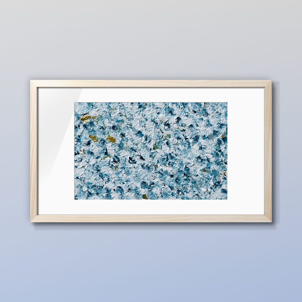 澄んだ青空の下、花びらが舞う幻想的な世界を描いた作品です。青色のグラデーションが心に広がり、穏やかで心安らぐ空間を創出します。夢の中にひそむ安らぎを求めるような感覚を体験させてくれる、まさに心の聖域とも言える一枚です。優雅に舞う花びらたちが、日々の喧騒から解放されるひとときを演出してくれるでしょう。