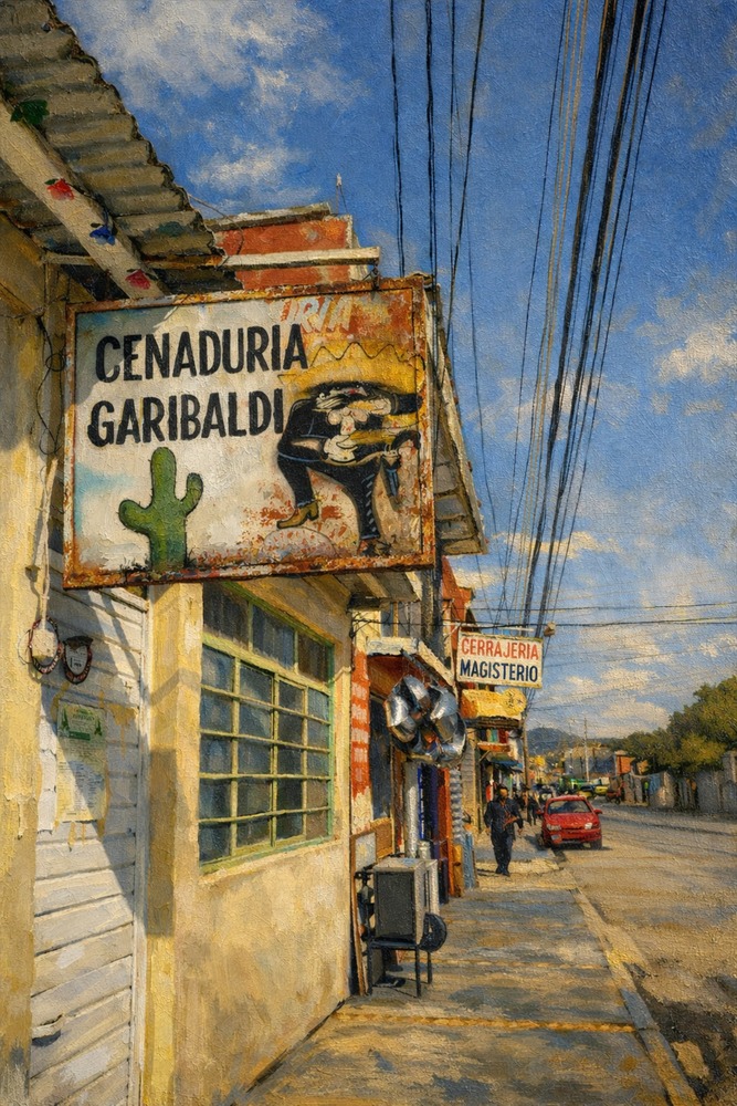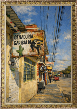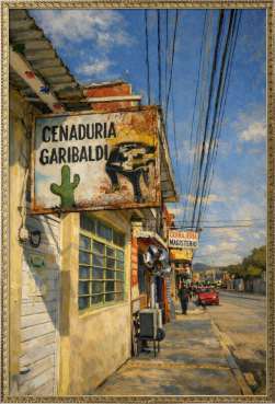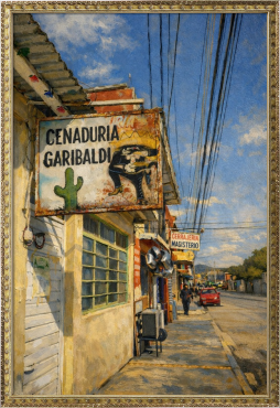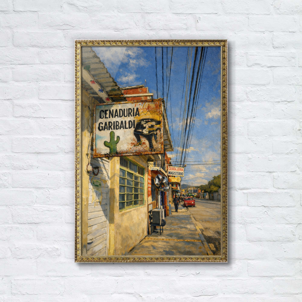 メキシコの街角で出会った、静かな午後の風景をもとに制作した油絵風デジタルアート作品です。 南国特有の強い日差しと、どこか懐かしさを感じさせる街並み。看板や建物、道に落ちる影のひとつひとつに、ゆっくりと流れる時間の気配を込めました。