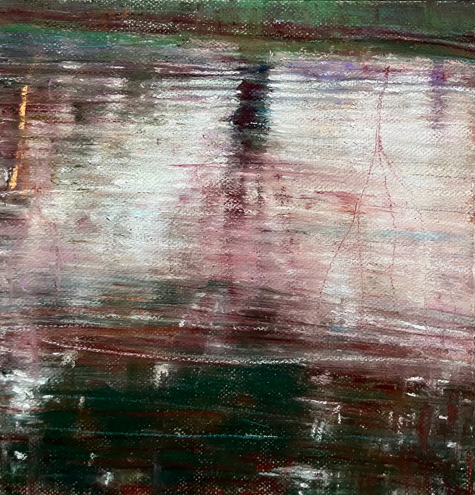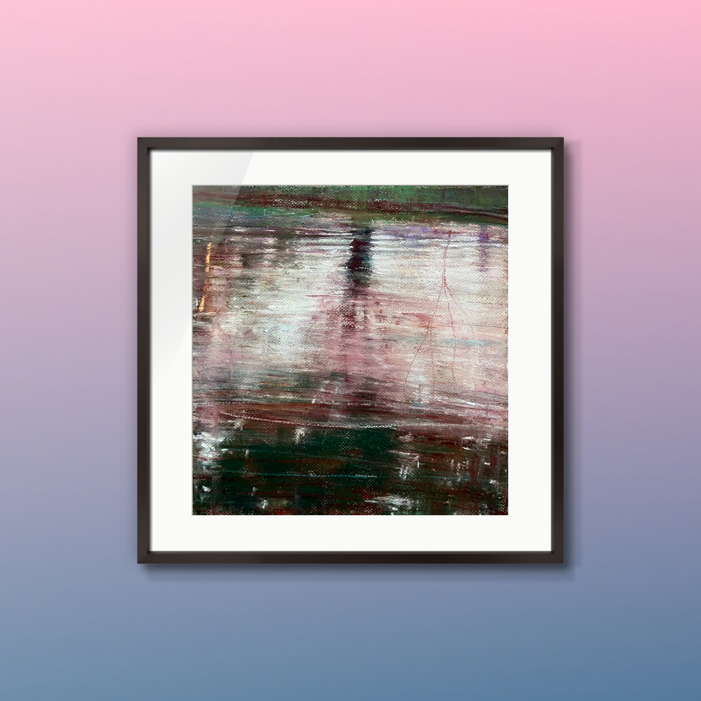 ここ何年かは京都を流れる鴨川をモチーフに描いています。古くから皆に親しまれている場所。其々の日常、其々の時間を過ごしています。私自身を癒される場所。そこには心地良い時間が流れています。この作品は鴨川の水面をクローズアップして描いているシリーズです。水面は常に日常を写し出し、その一瞬一瞬で様々な表情をしています。それはとても美しいです。