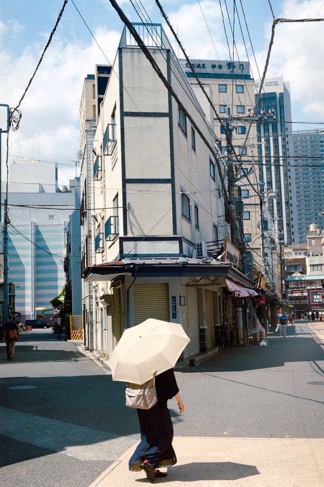 A white umbrella stands out at a small, deserted intersection.