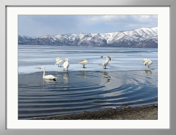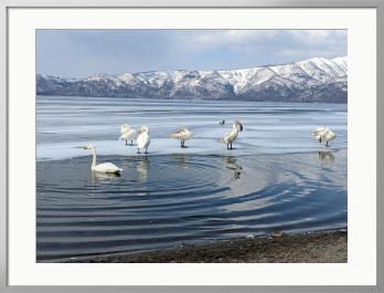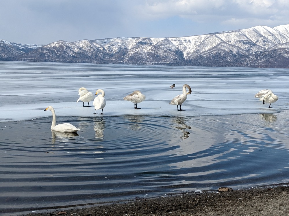 屈斜路湖に春の訪れが近づくころ、ハクチョウたちが戻ってきます。砂湯は地底から熱水が湧き出るので氷がいち早く融けるのです。