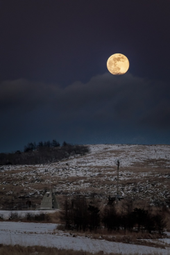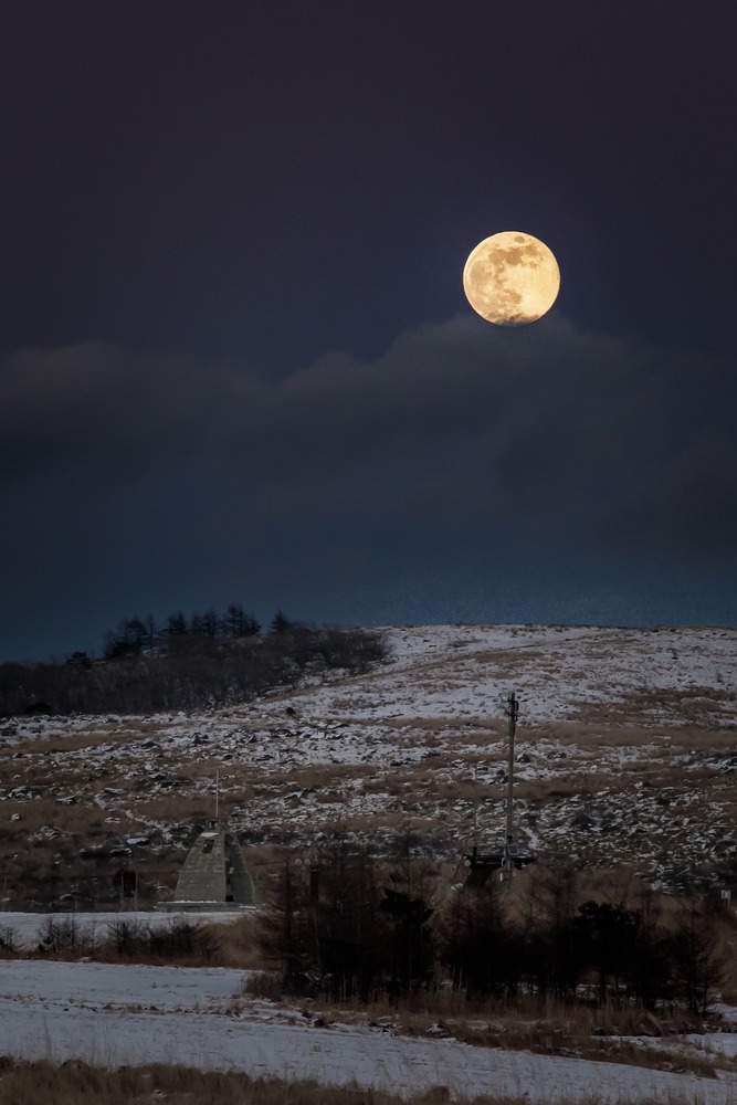 2026.01.03 霧ヶ峰霧鐘塔付近の写真。薙鎌神社からの帰り道、見上げたら大きな満月があり、驚きました。自分が狼なら1月の満月ですし、遠吠えをあげてましたね。また霧鐘塔は1959年に設置されたそうです。