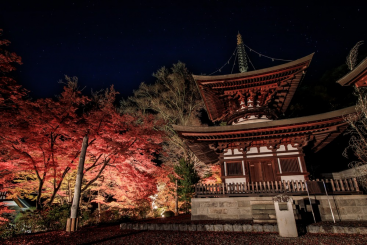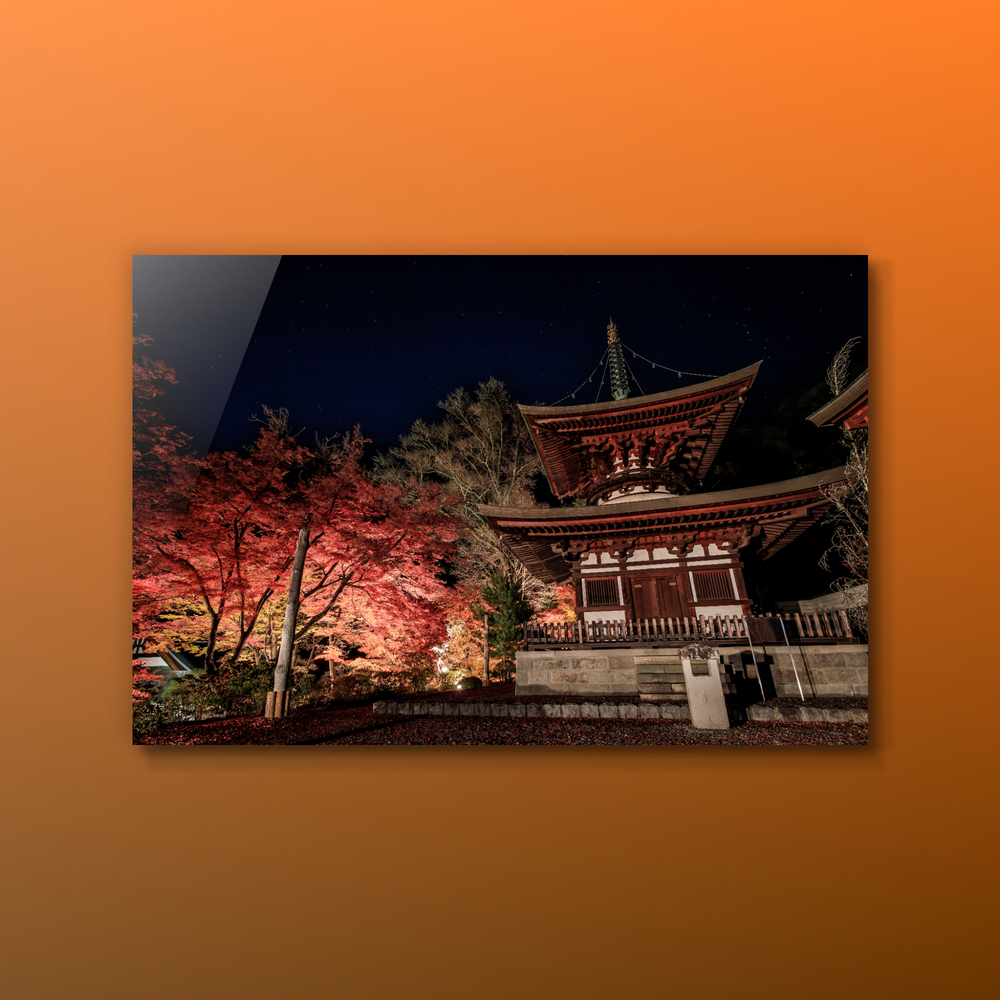 2025.11.15 温泉寺の写真。仕事終わりに特急に乗って、真っ先に向かうは温泉寺の紅葉ライトアップ。たまたま座禅会もあり、参加しました。多宝塔には諏訪大社の御神体として崇められていた鉄塔が安置されています。 石田健悟 写真展「諏訪の風景」で展示。