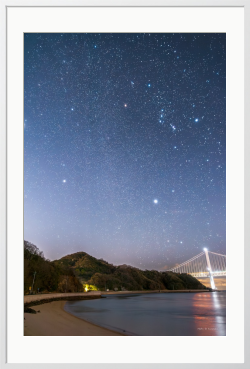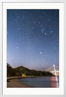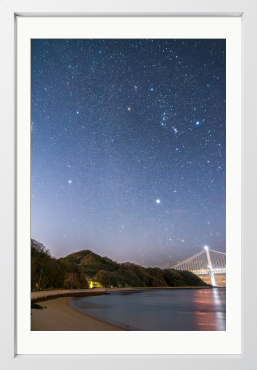 冬の夜、静かな浜辺に無数の星が降り注ぐ。 海と空の境界が溶け、橋の光と星明かりが穏やかに重なる一瞬。 日常から少し離れ、深呼吸したくなる夜の風景。