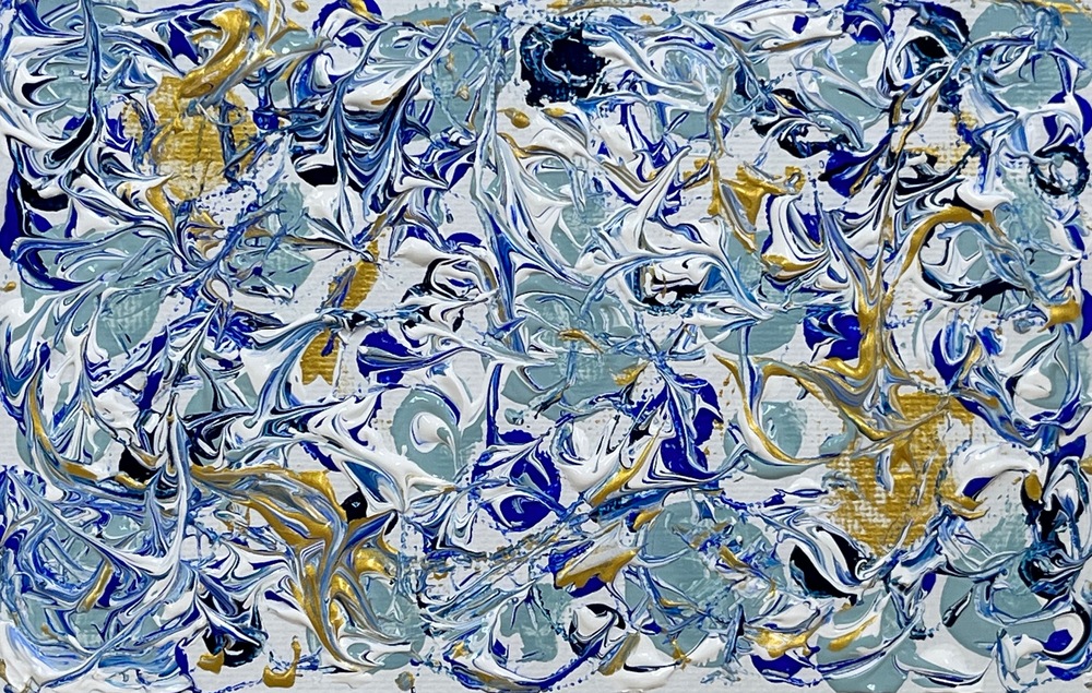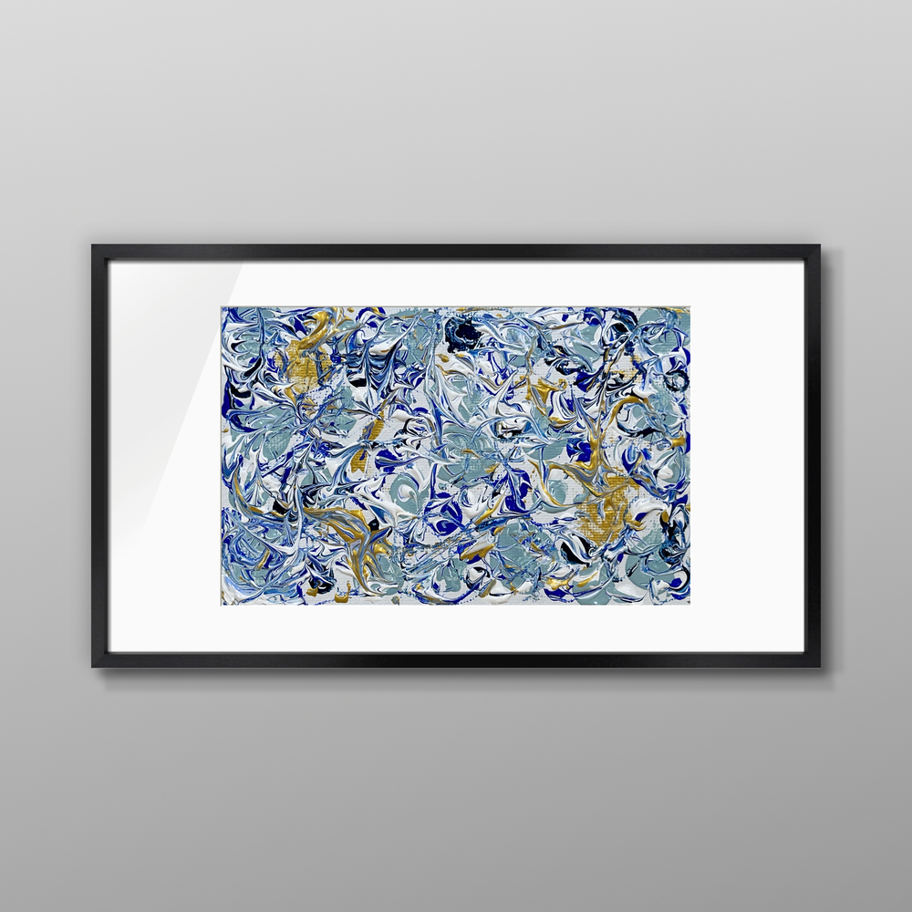 深い青と輝く金色の旋律が織りなす渦が無限の動きを閉じ込め、静かな画面の中で永遠に回り続けるような躍動を感じさせます。混沌の中から生まれる輝きの断片は、見る人の心に濃厚な色彩と力強い動き残し、常に新しい発見を与えてくれます。