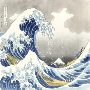 葛飾北斎の名作『富嶽三十六景』の中でも最も名高い「神奈川沖浪裏」をモチーフに、伝統的な浮世絵の木版画スタイルをあえて瑞々しく柔らかな水彩画の技法で再解釈したこの作品は、天に向かって荒々しく逆巻く巨大な大波の動的な力強さと、その背後に毅然と、かつ静謐に佇む富士山の不動の美しさが対照的に描かれており、本来の力強い輪郭線や鮮やかなベロ藍の色彩が水彩特有の繊細なぼかしや淡いグラデーションに置き換わることで、自然の猛威の中にもどこか幻想的で穏やかな叙情性が漂う独特の世界観を構築しているだけでなく、翻弄される小舟に乗る人々が放つ極限の緊張感と、空を覆う灰白色の雲から透ける光の粒子のような表現が絶妙に融合し、時を超えて愛される古典的な構図に現代的な軽やかさと新たな生命を吹き込むことに成功しています。
