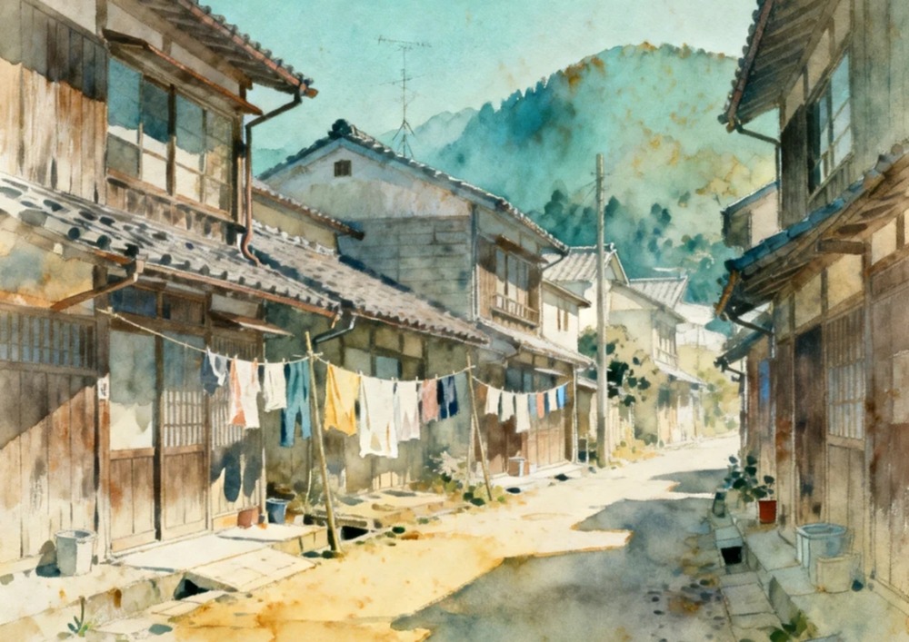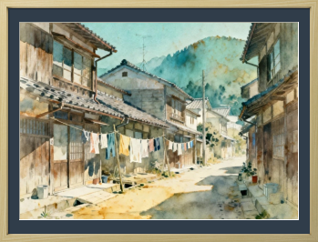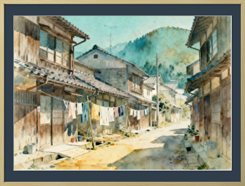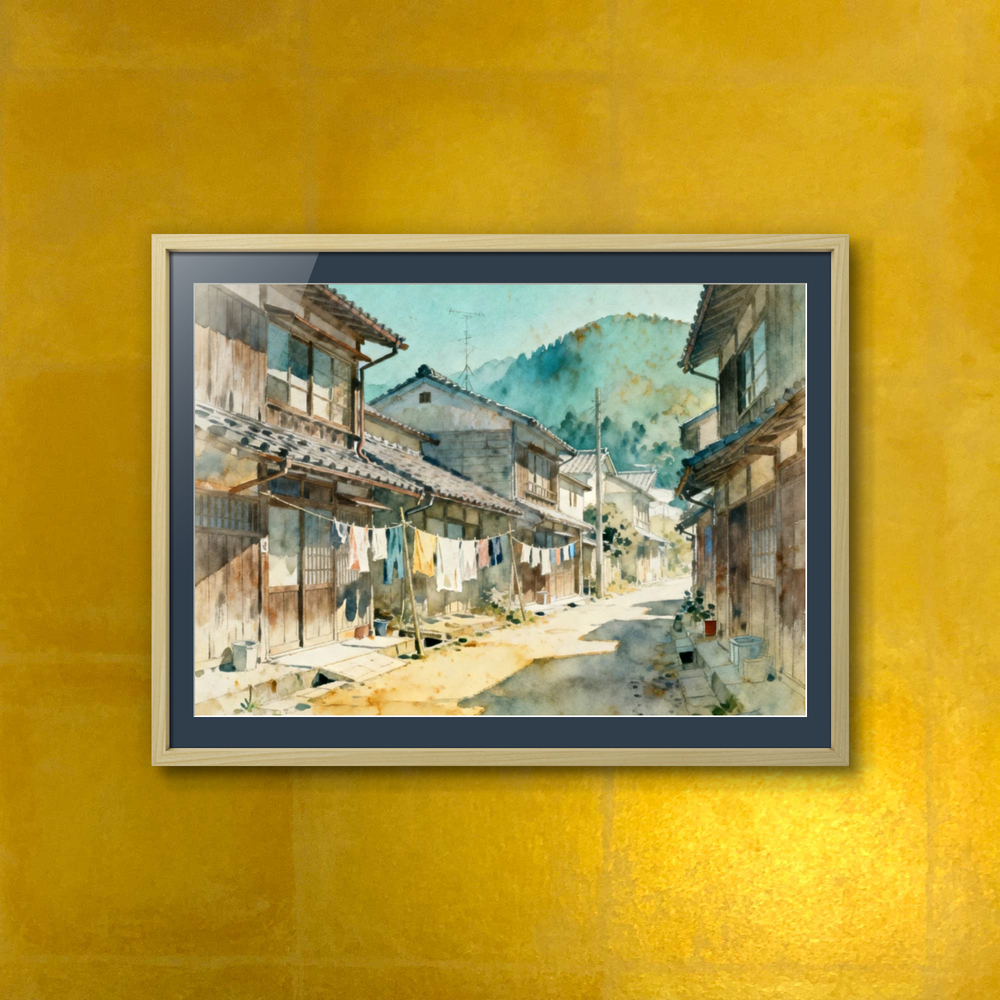 この作品は、日本ののどかな田舎町の風景を繊細な水彩画で描いており、木造の古い家並みの間に張られた物干しロープで洗濯物が静かに揺れる日常のワンシーンを、柔らかな光と影のコントラストで表現しています。 背景には淡い緑の山々が連なり、画面全体から昭和の懐かしさと穏やかな午後の空気感が伝わってくる一作です。