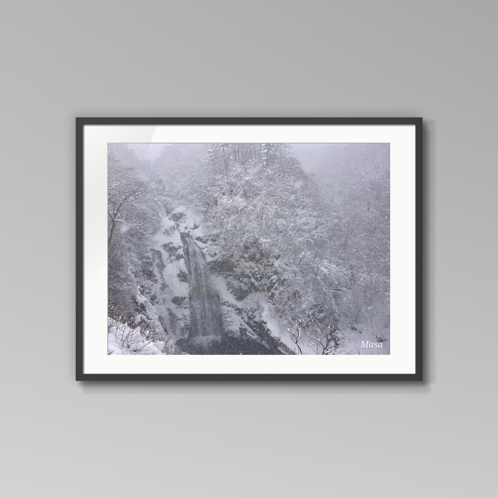 降りしきる雪に包まれながら、ひたすらに流れ続ける滝。 白に覆われた森と岩肌は音を吸い込み、世界は静寂へと溶け込んでいく。 凍てつく空気の中でなお躍動する水の流れは、 自然の厳しさと、揺るがぬ生命の強さを静かに語りかける。 本作は、冬の一瞬の気配と、永遠にも思える時間の流れを写し取った一枚です。 空間に凛とした静けさと深みをもたらします。
