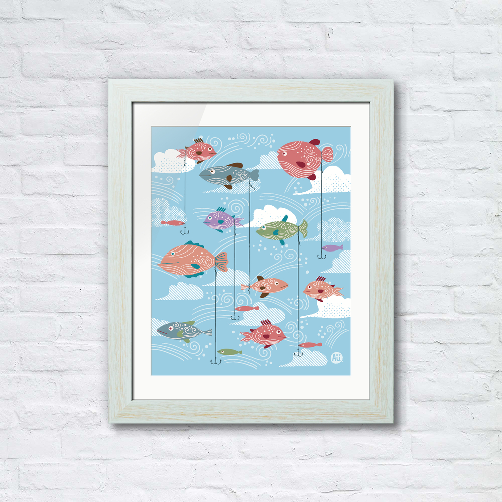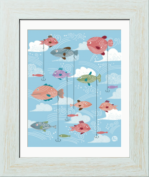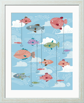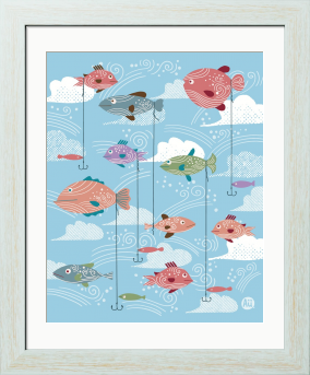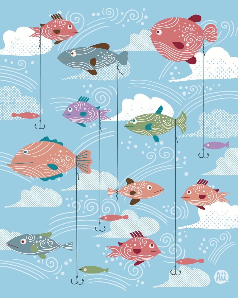 魚釣りをする魚たち。うずまき模様の魚たちが空を泳ぎます。