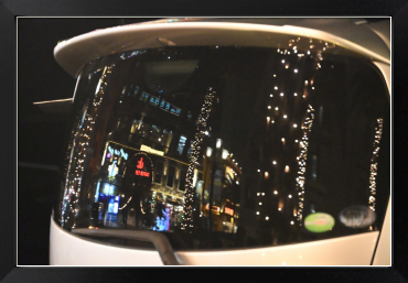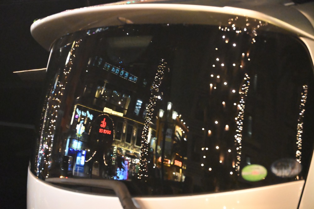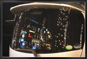 アメリカンビレッジのクリスマスイルミネーションが車の後部ガラスに美しく反射していました