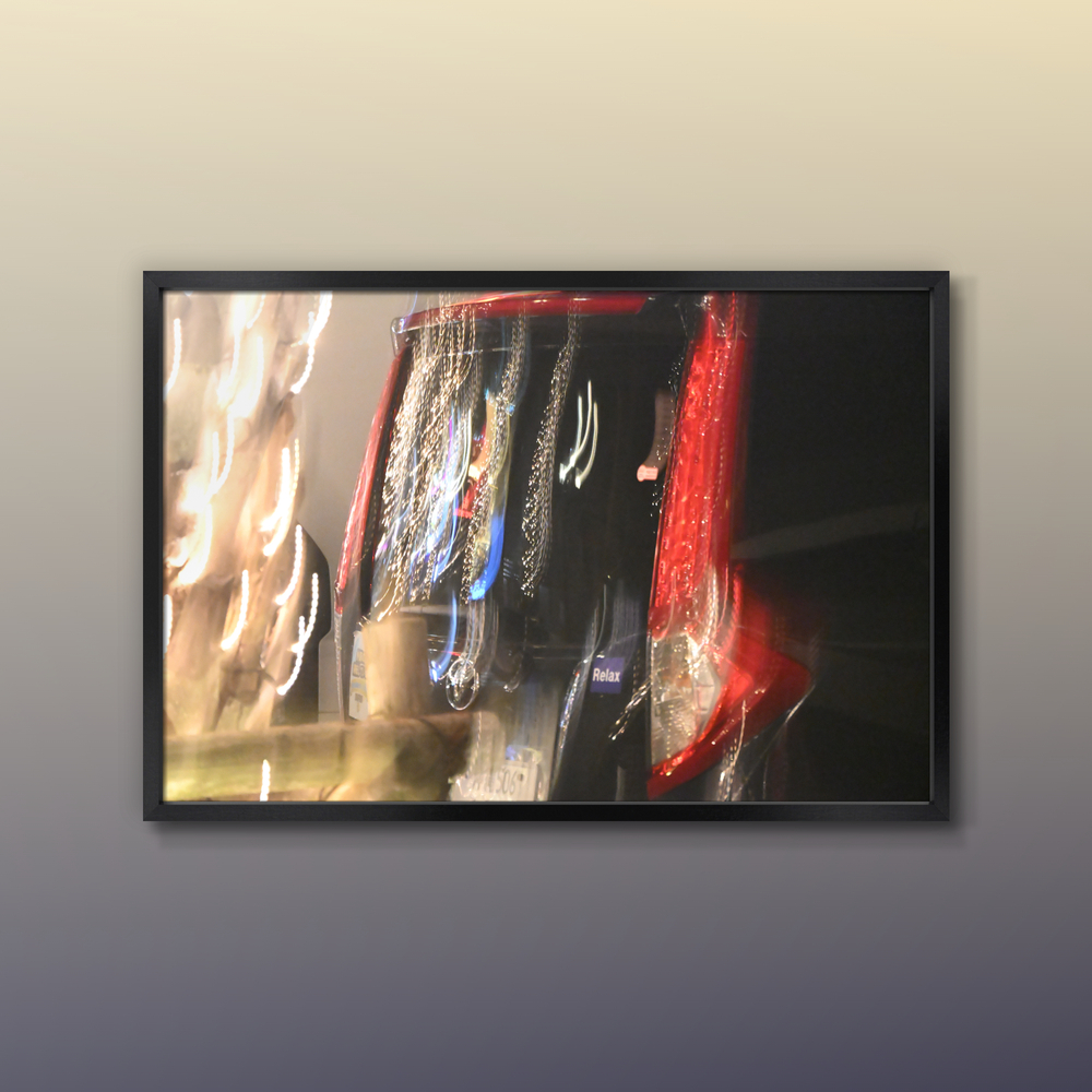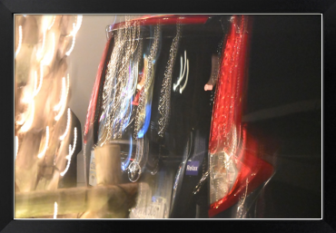 アメリカンビレッジのクリスマスイルミネーションが車の後部ガラスに反射していた