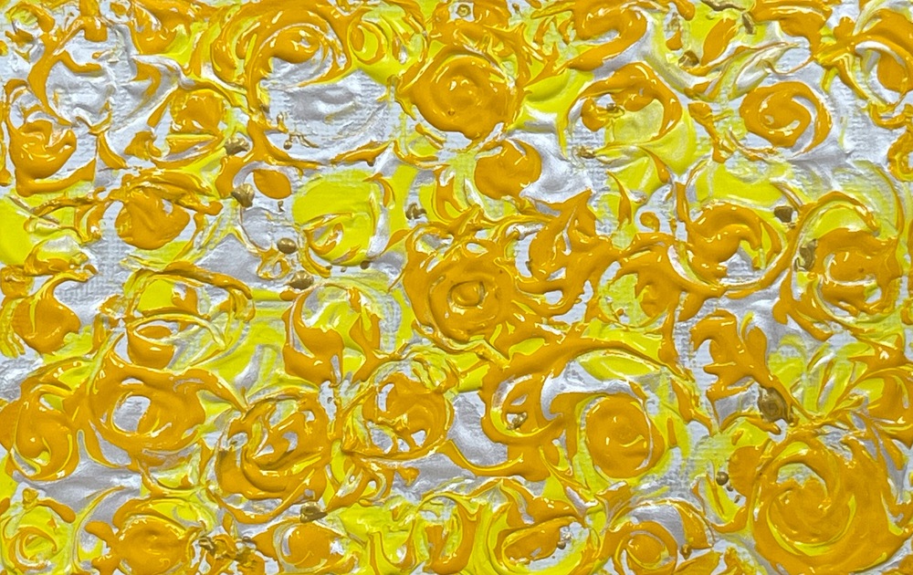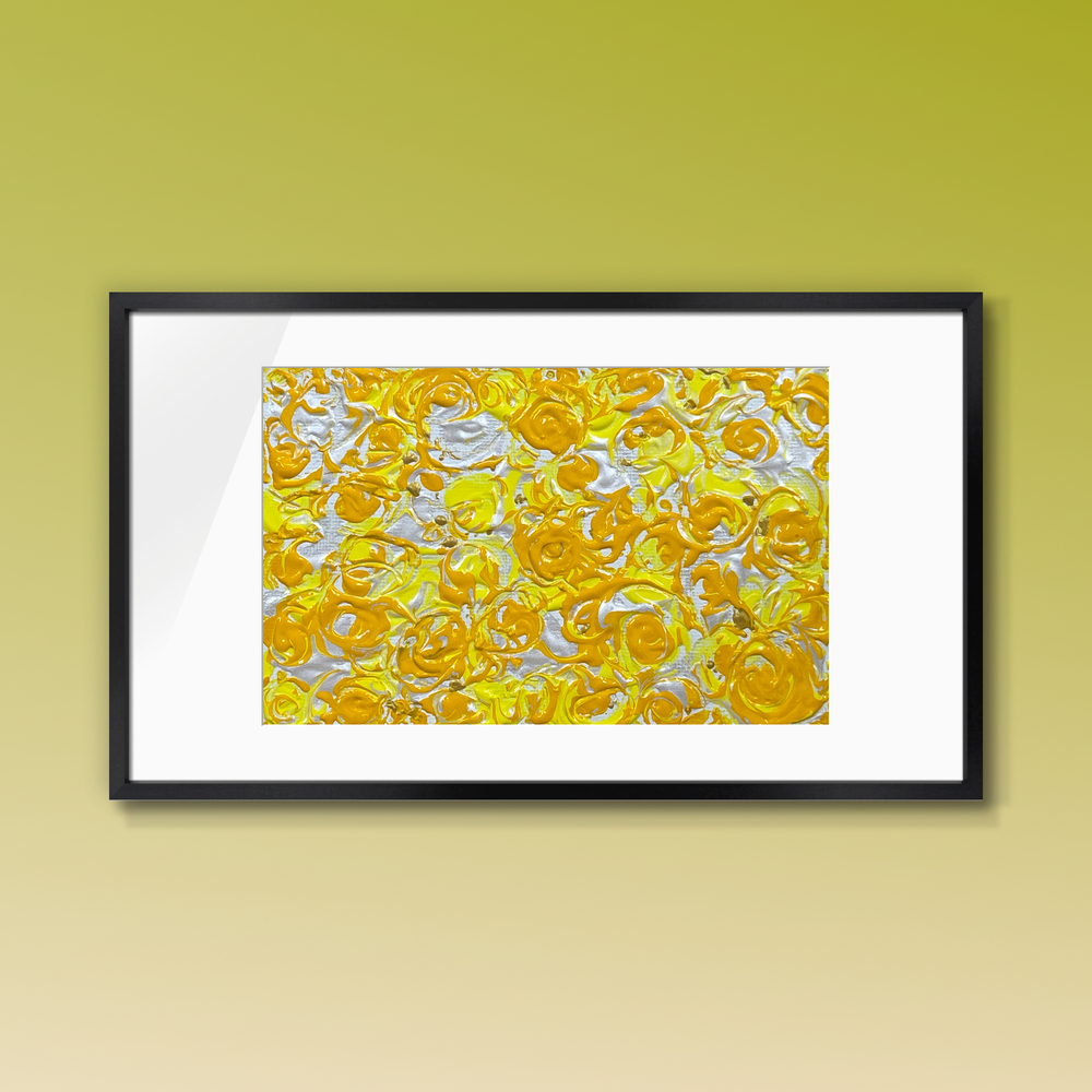 柔らかな山吹色が織りなすヴェールのように、陽光を閉じ込めた色彩が静かに息づいています。温もりある抽象の調べは、まるで夕暮れの柔らかな光を映し出すかのように、心に温かな安らぎを与えます。この作品は、繊細な色合いが空間を豊かに彩り、観る人に静寂なる美しさを感じさせることでしょう。また、特有のうねりが調和し、心の平穏をもたらす瞬間を大切にしています。
