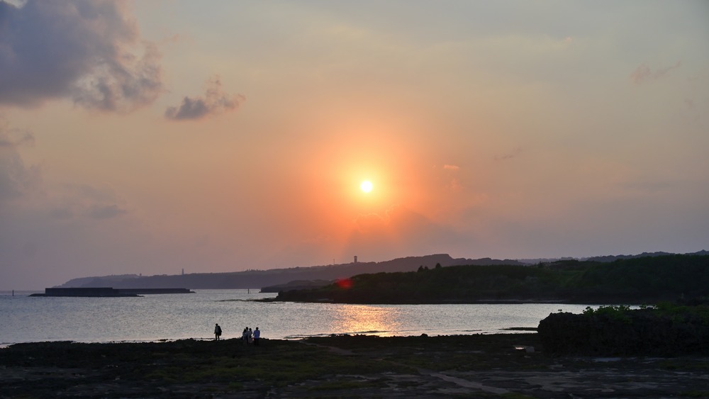 日没の迫る奥武島の岩場に日没を見にやって来た人々がいました