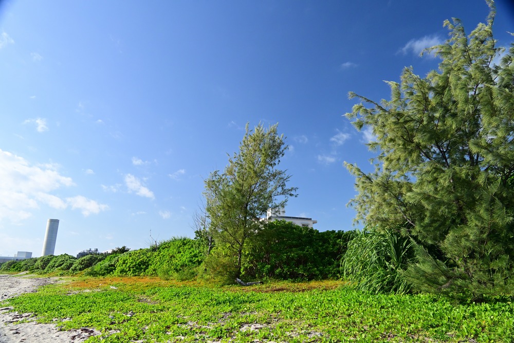 爽快で解放感に満ちた冬の晴天が覆う中城湾の海岸
