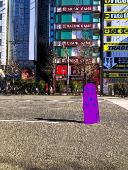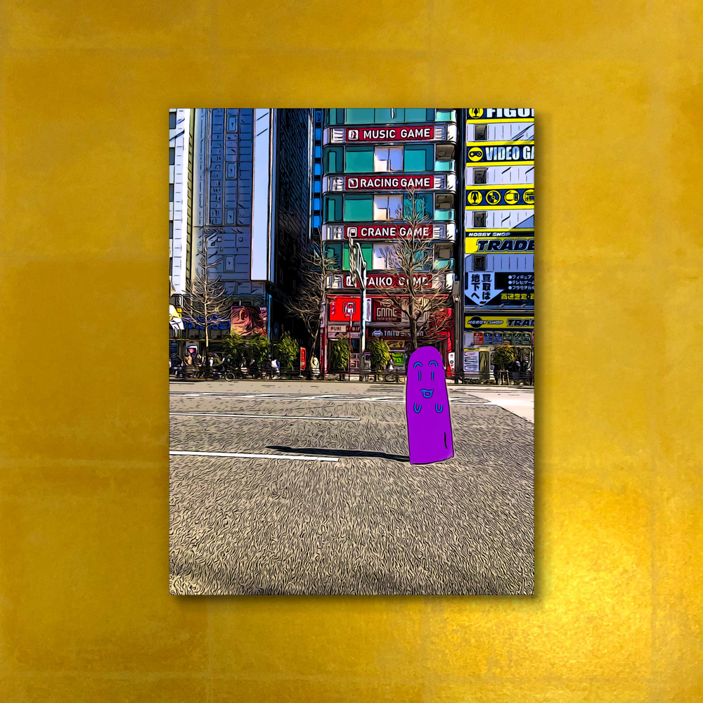 私は「脱力して気楽に今を楽しむ」をコンセプトに各地に赴いてそこで個人的に良いなと思った人が写り込んだ風景を撮って、それをもとに観光絵画を制作しています。現実の風景の写真をデジタル加工して絵画風にしたりオリジナルのキャラクターを入れ込むことで、風景の日常の魅力の中に未知性の余白を持たせて、行ってみたい見てみたいと思う気持ちに繋がって欲しいと思っています。この作品はキャンバスに出力する前の原画です。