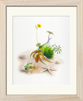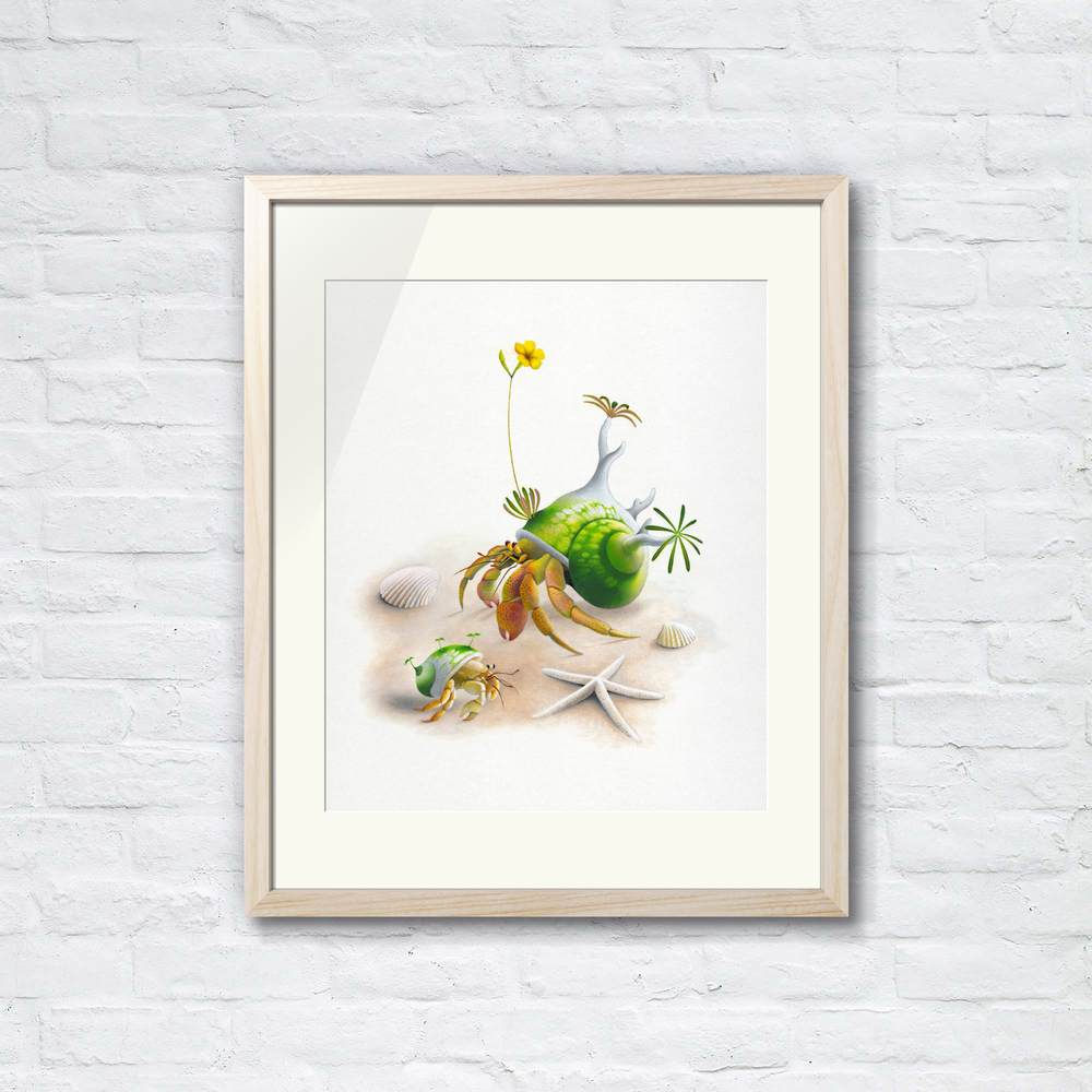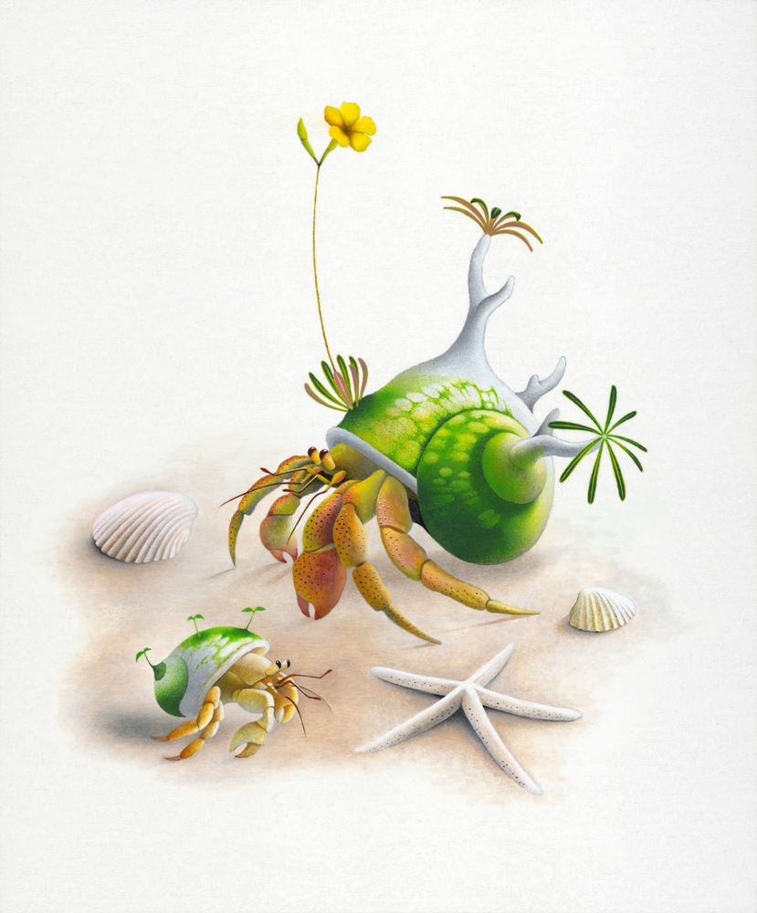 砂浜で日光浴を楽しむ2匹のヤドカリを描いた作品です。 大きなヤドカリの貝殻には立派な塊根植物が生えていて、鮮やかな黄色い花を咲かせています。 その生き生きとした花を眺めて満足そうな大きなヤドカリと、それを羨ましそうに見つめている小さなヤドカリ。二匹の対照的な表情が、砂浜の穏やかな時間にユーモアを添えています。 自然の共生が生んだ小さな奇跡を、アクリル画特有の柔らかな色彩で温かく表現しました。