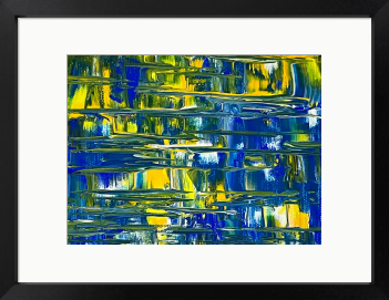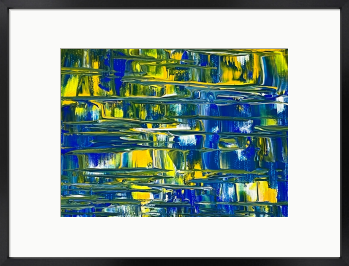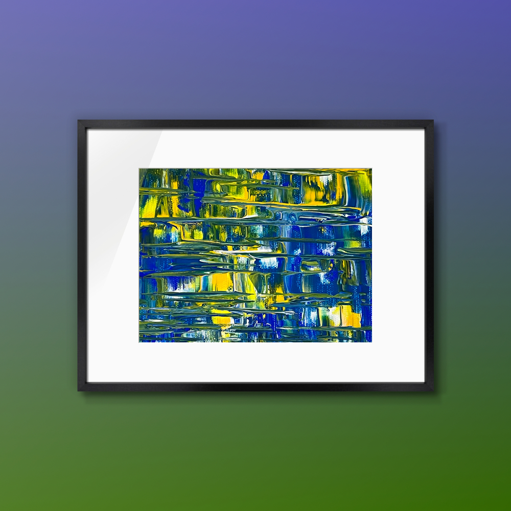 深い青色が重なり合うコバルトブルーの調和が広がり、柔らかな黄色の光が静かに差し込むアクリル抽象画です。遠くの光が水面を照らすような、穏やかで希望に満ちた情景が、心に響く美しいひとときをもたらします。日常に静かな輝きを添える一枚です。