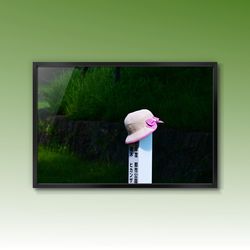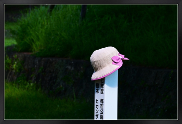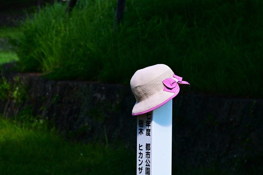 夏の公園のウオーキングコース、忘れ物を見つけた誰かが拾い上げて、記念植樹の杭に被せたみたいでした