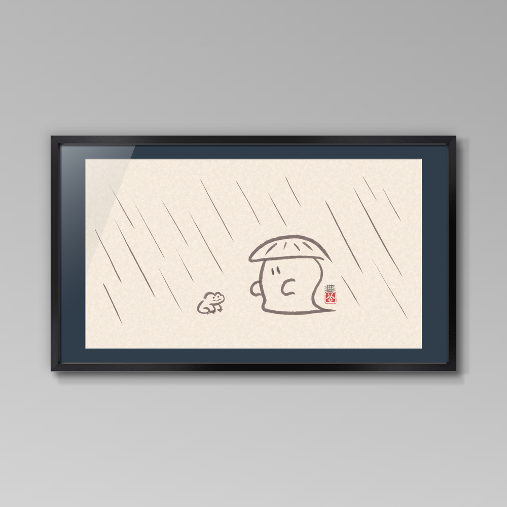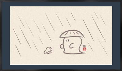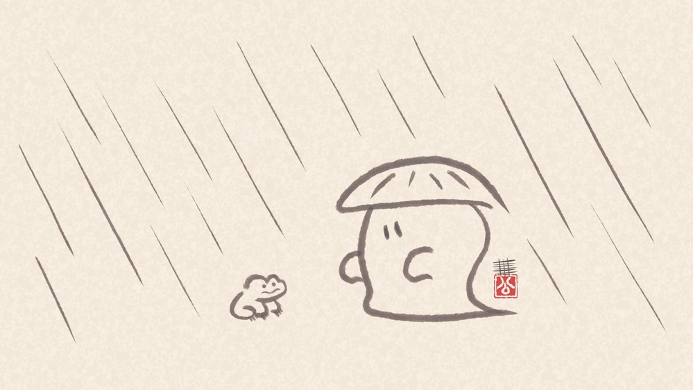 霊和 陰陽 戯画(れいわ いんよう ぎが)シリーズ。 雨と蛙と笠を被った霊。 ※こちらは原画ではありません。