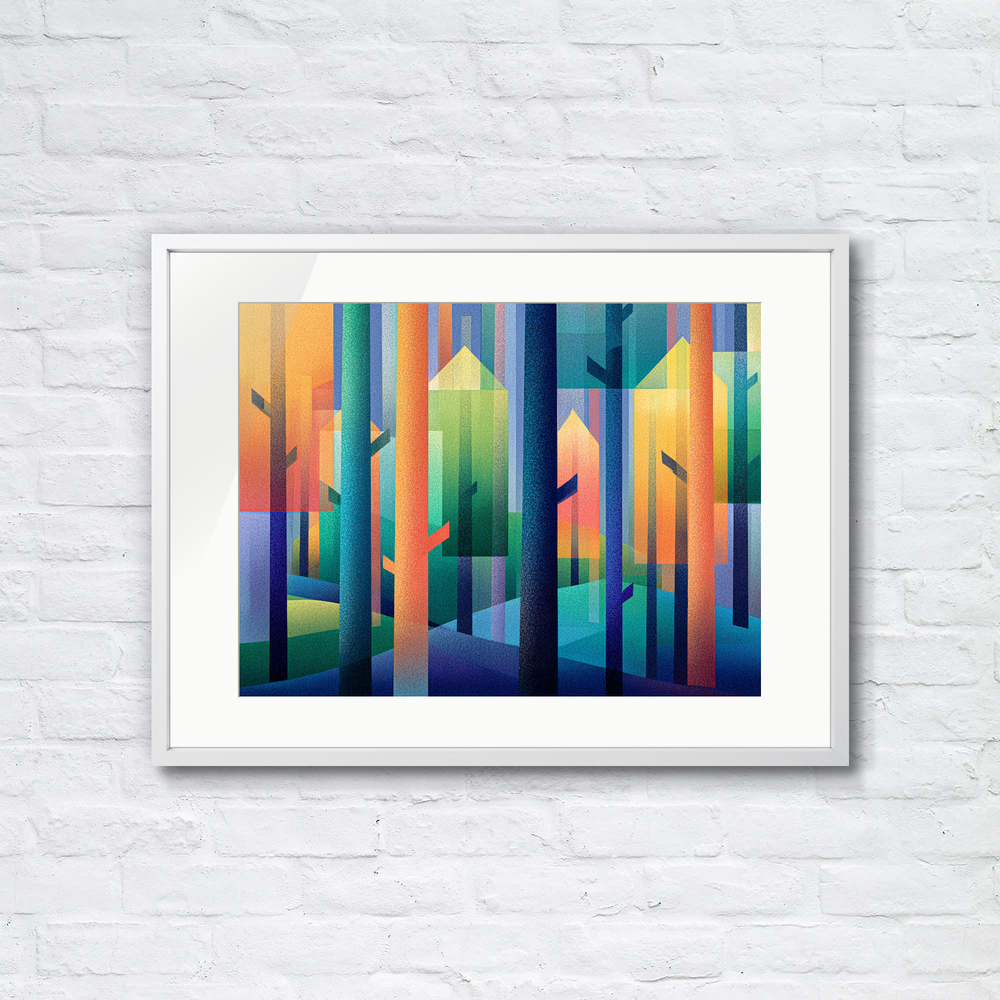 まっすぐな線と色の重なりで光を描きました。お部屋に飾ると心がすっと軽くなるような優しい色彩をどうぞ。