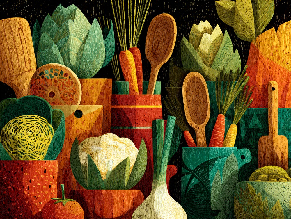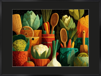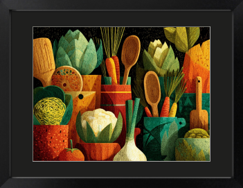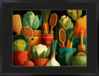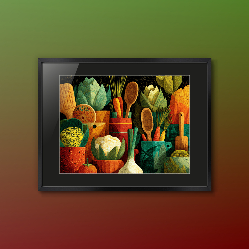 使い込まれた道具と旬の野菜がひしめき合う、賑やかな台所。美味しい予感がギュッと詰まった、活気あふれる一枚です。