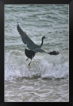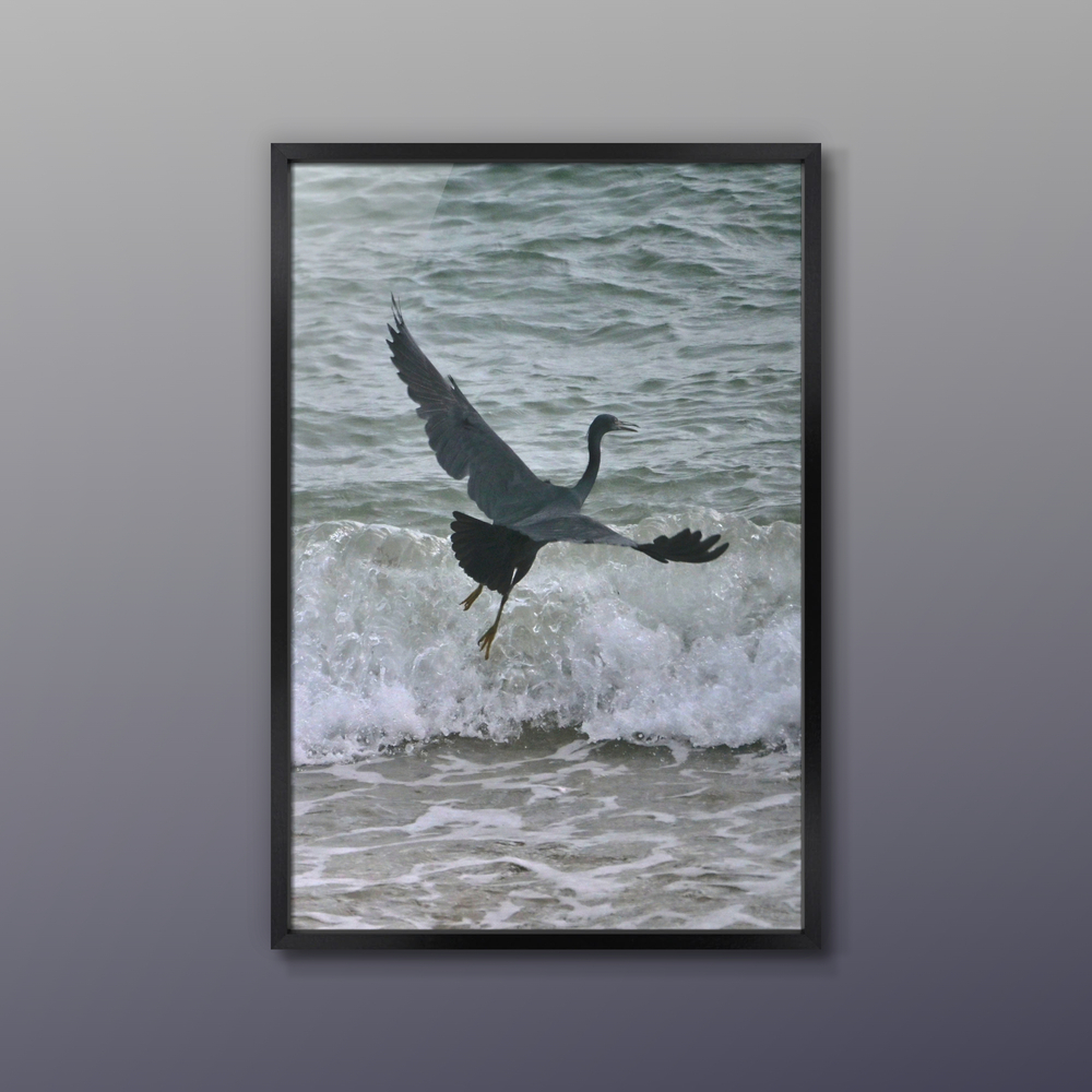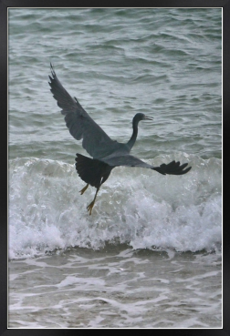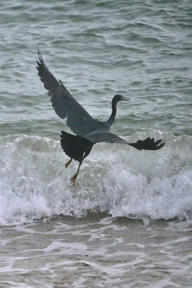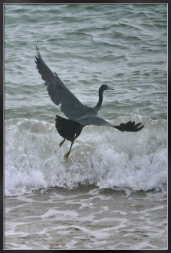 オフシーズンの人影のないビーチの波打ち際で漁をするクロサギがいました