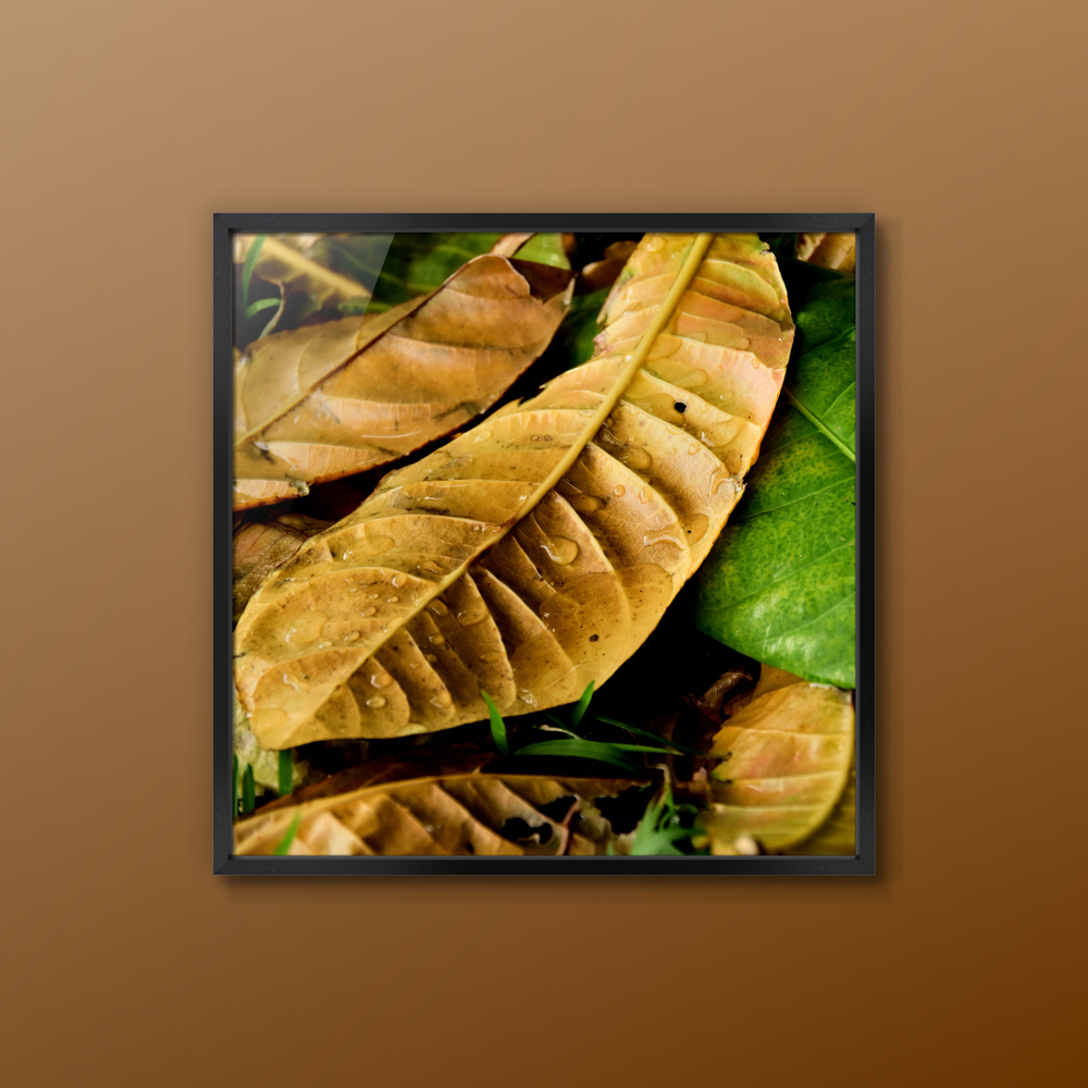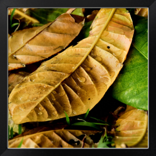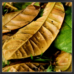 Title:雨上がりの雫が付くサガリバナの大きな落葉