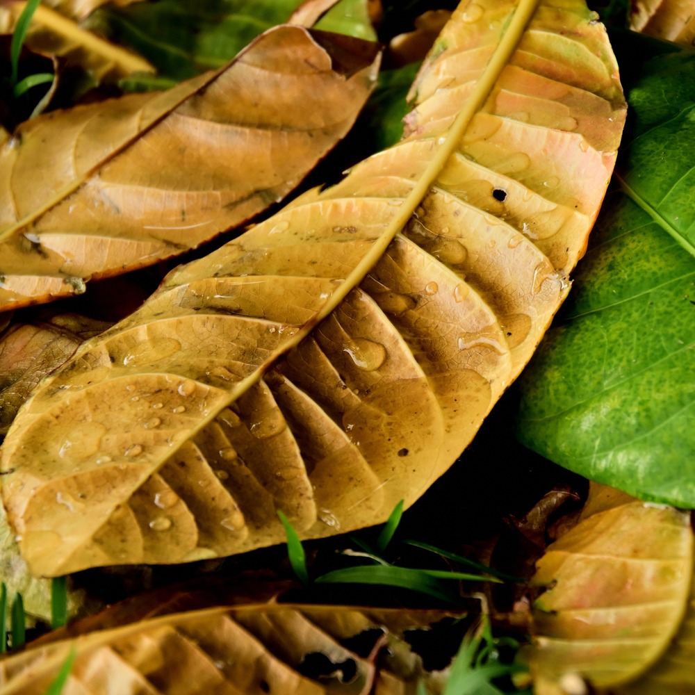 大振りで美しい皺のよるサガリバナも黄色い落ち葉になります。雨上がりの雫を纏う様子も美