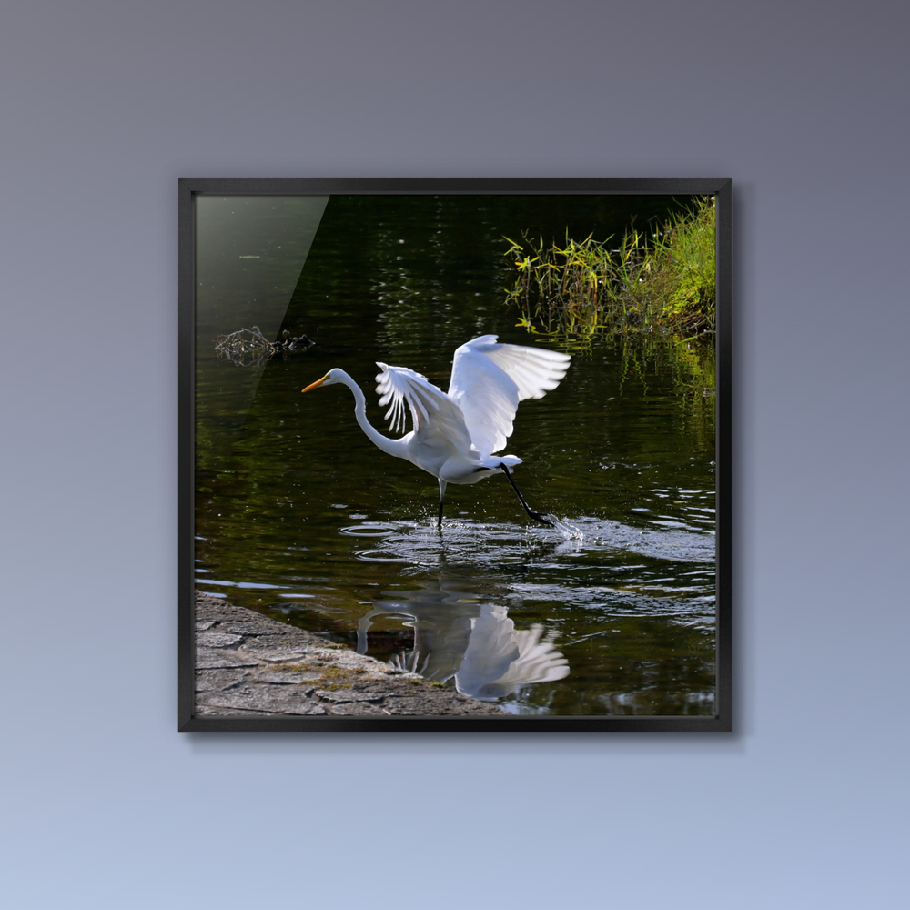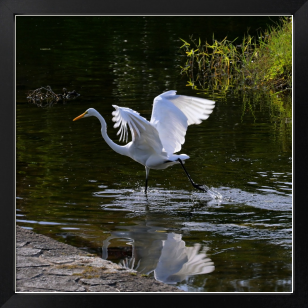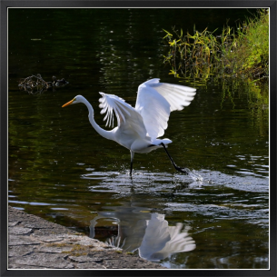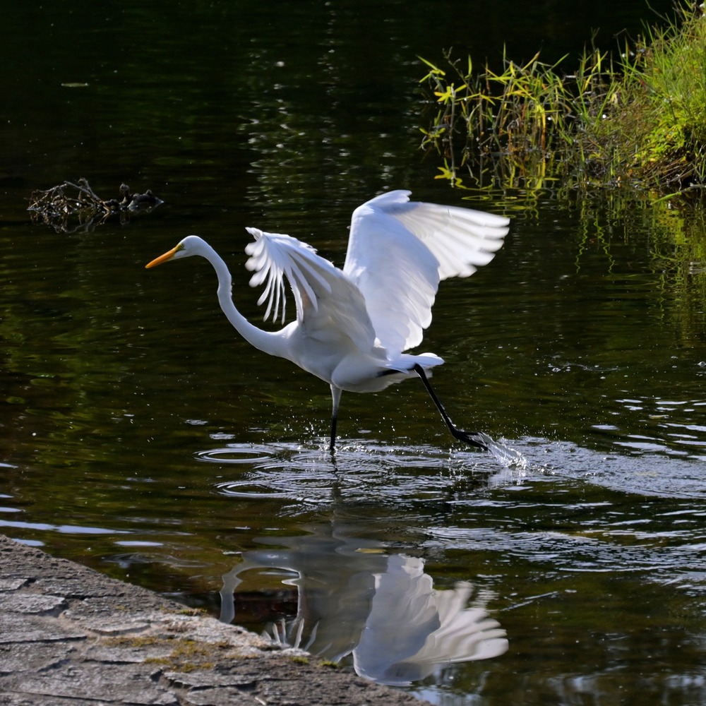 池の浅瀬を跳躍して魚をとるダイサギ