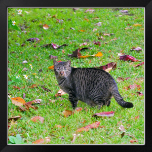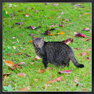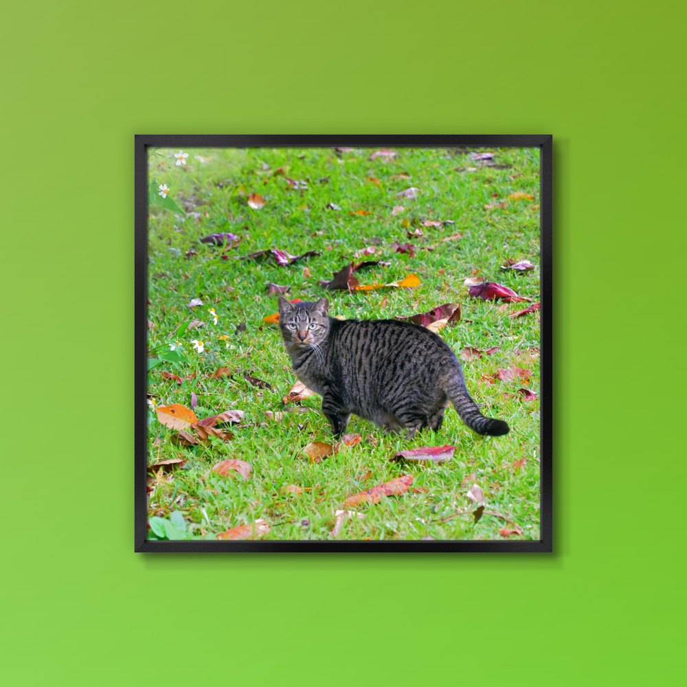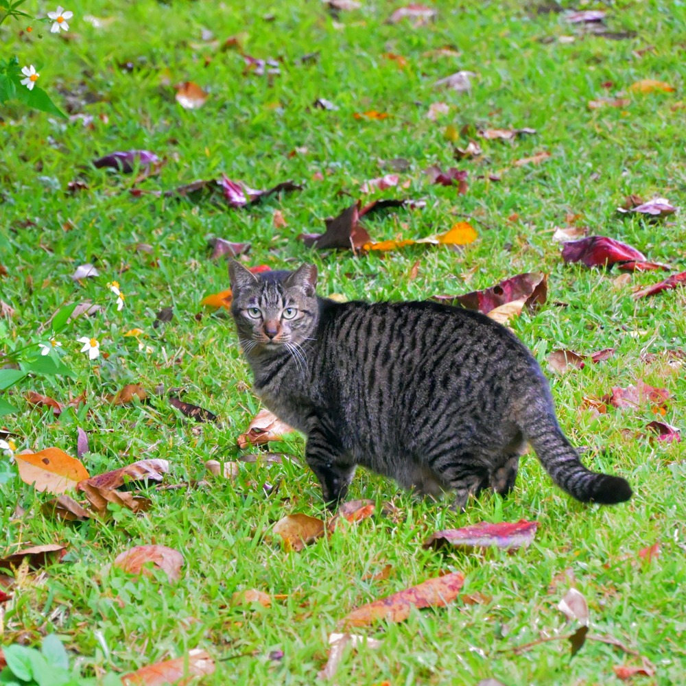 色の対比が鮮やかな場面に驚いて立ちすくむ野良猫