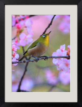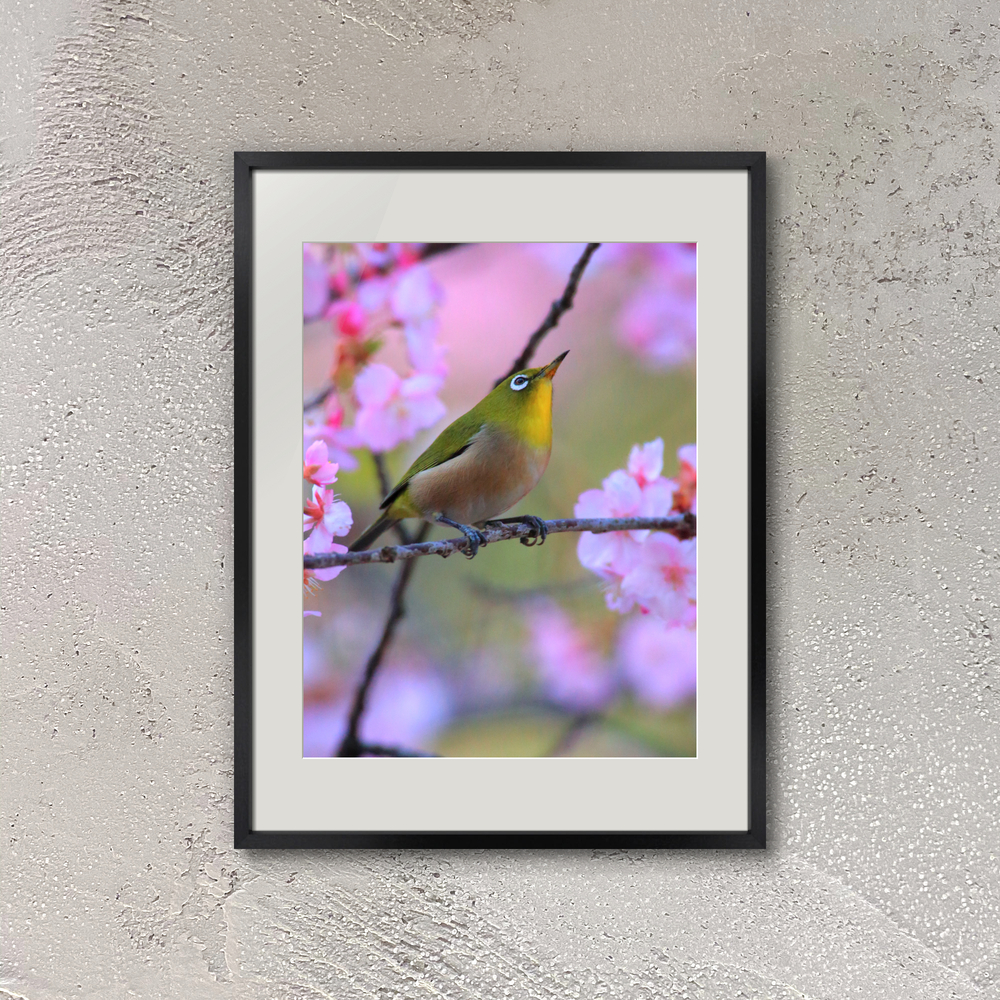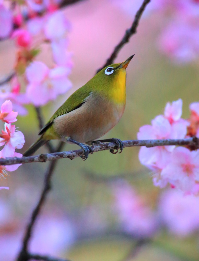 週末に一気に満開になった河津桜に蜜を吸いに飛んできたメジロ、ヒヨドリの隙を突いて、甘い蜜のある花を探し回ります。
