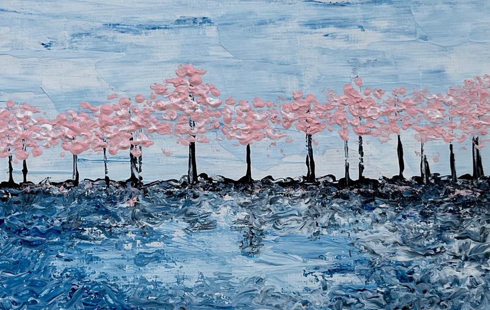 淡い青の空に、優しく揺れる桜の輪郭が浮かび上がるこの作品は、春の訪れを静かに感じさせます。厚みのある筆致が生み出す色の層は、儚さと広がりを織りなし、心にそっと寄り添う穏やかな余韻を残します。見る者に安らぎを与え、特別な空間を演出してくれるでしょう。