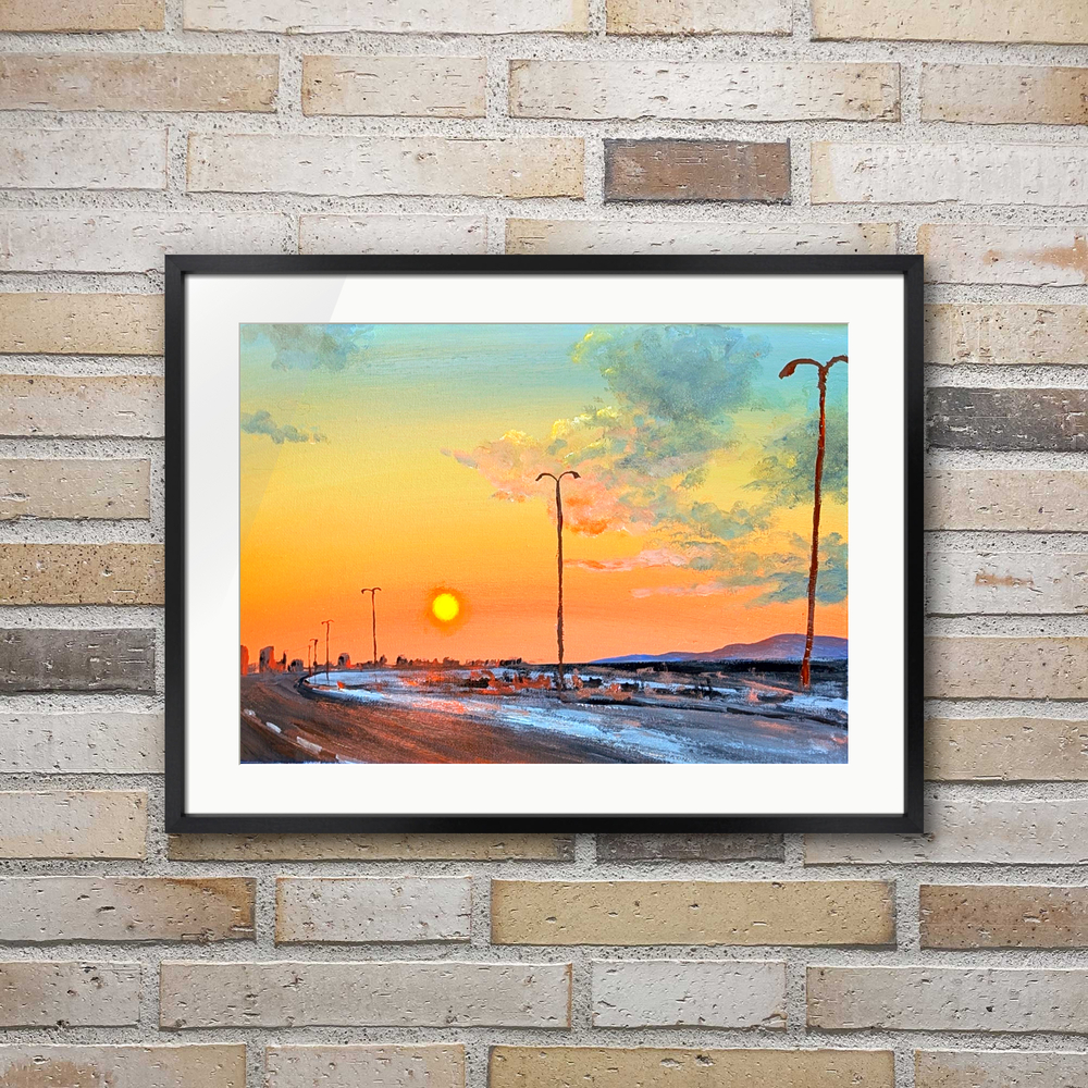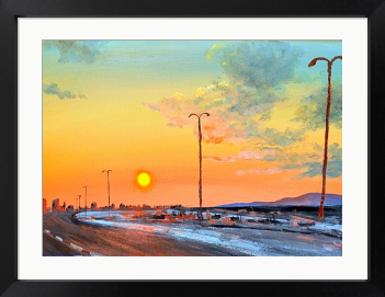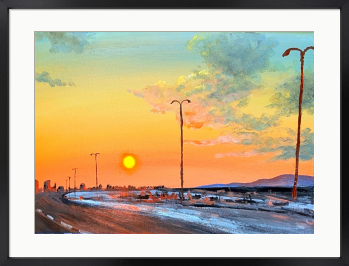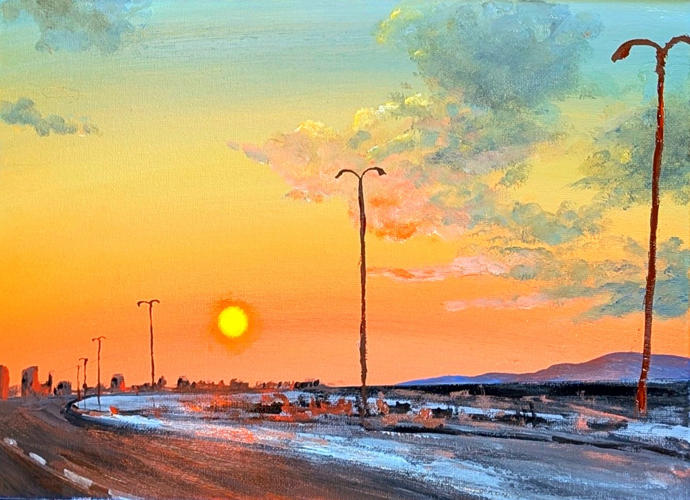 街からの帰り道、高速道路を西に向かって走ると夕陽が大きく見えてました。「今日も一日お疲れ様でした」の声が聞こえてきそうな景色を描きました。