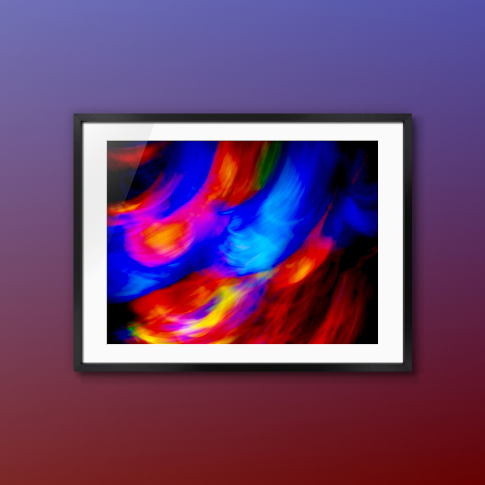 Turbulence of Spectrum, Opus 003 は、青を基調とした深い流れの中で、赤、橙、黄の光が渦を描くように交差し、色彩そのものが運動体として振る舞う瞬間を捉えた作品です。
