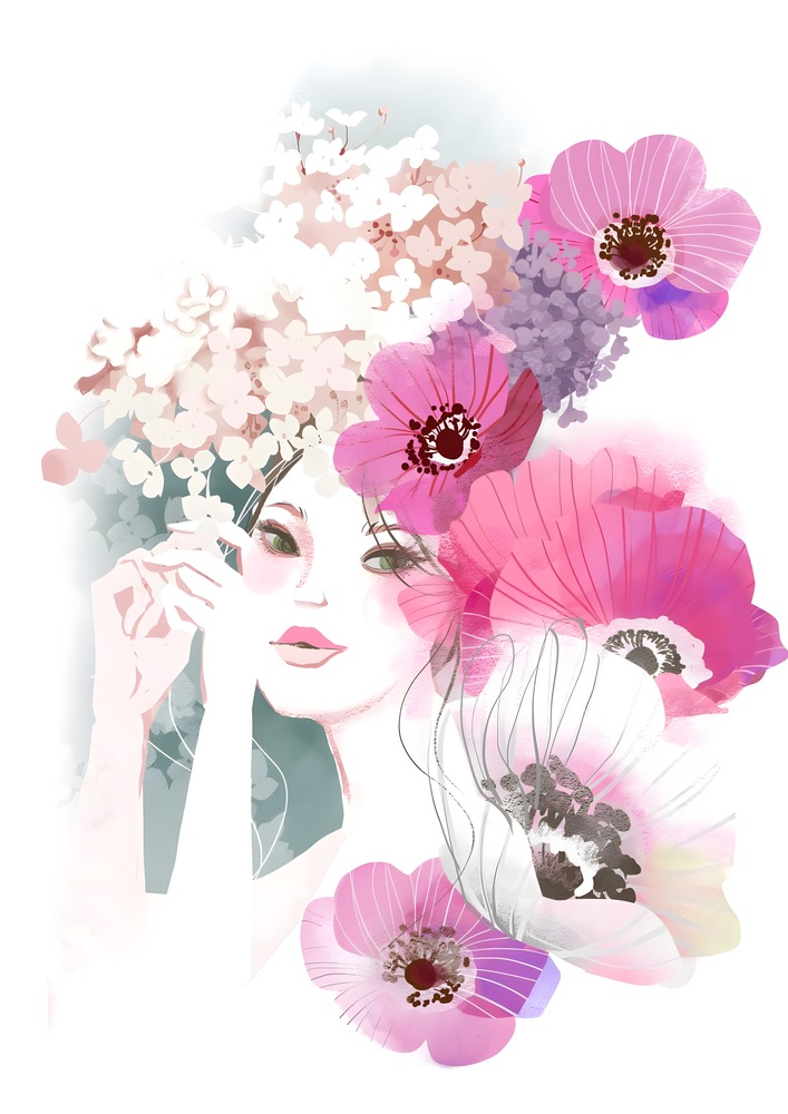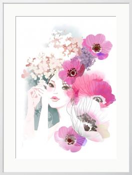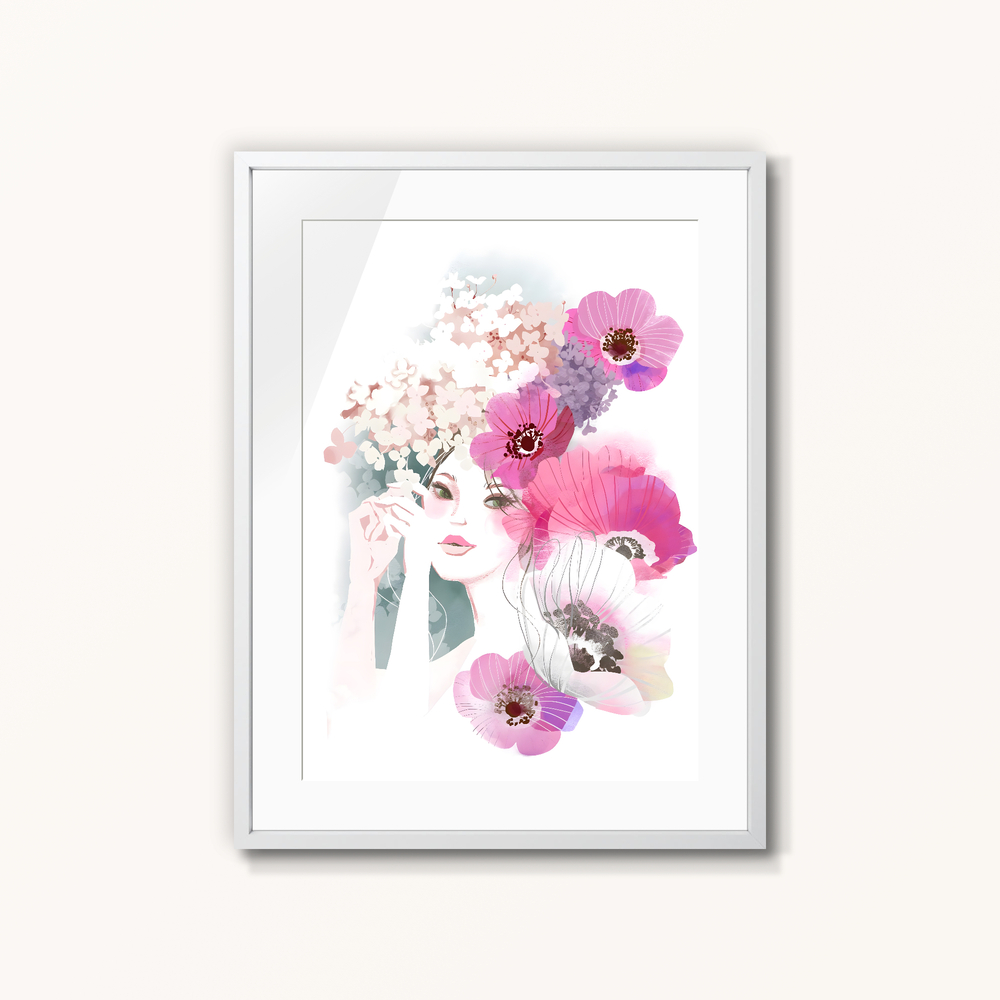 アネモネと紫陽花、女性を描いたイラスト作品です。 水彩の滲みと細い線画を重ねたミックスメディアのテイストで仕上げており、淡い透明感のある色調と、ピンク・マゼンタ系の鮮やかな花のコントラストが特徴です。 余白を多めに取ったミニマルな構図のため、お部屋のインテリアに馴染みやすく、華やかさを添えてくれます。 リビングのメインウォールアートとして、またベッドルームやドレッサー周りなど、毎日目に入る場所にも自然にお飾りいただけます。