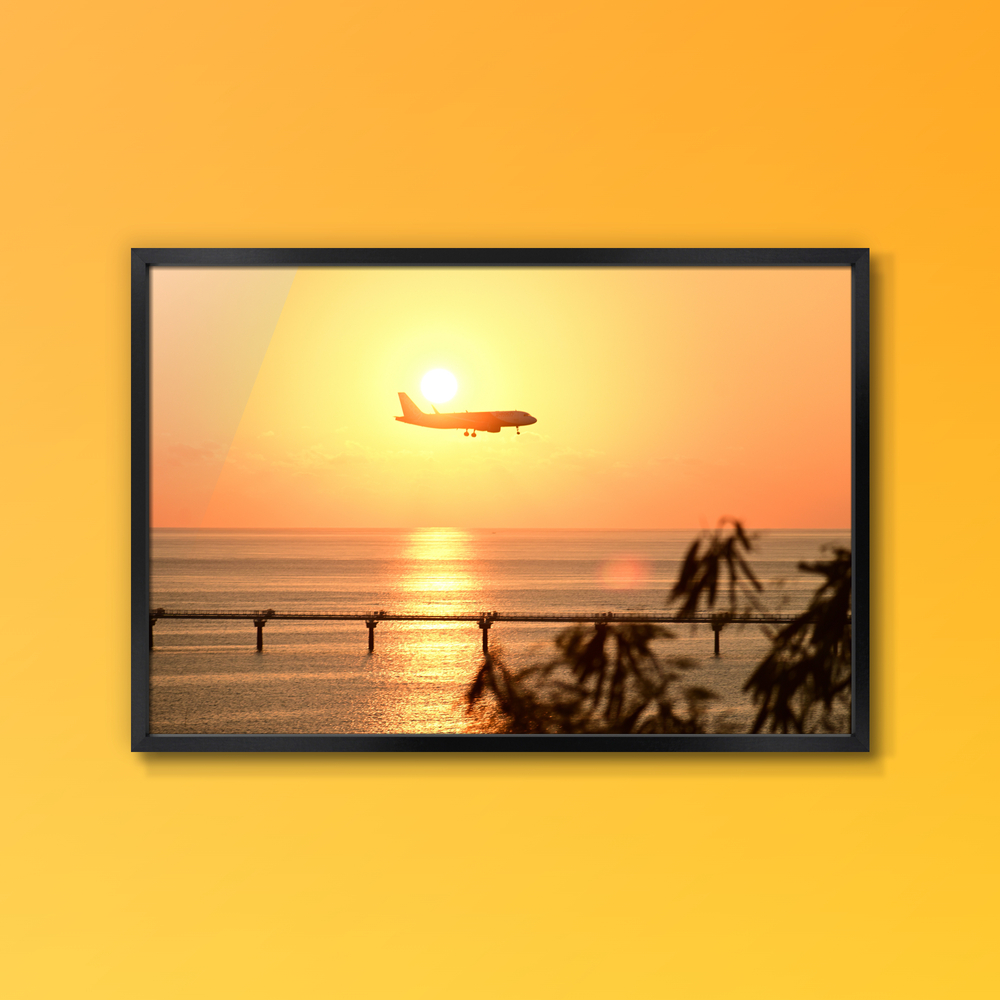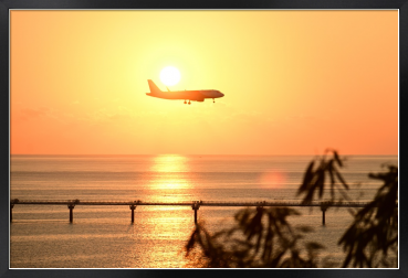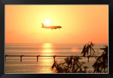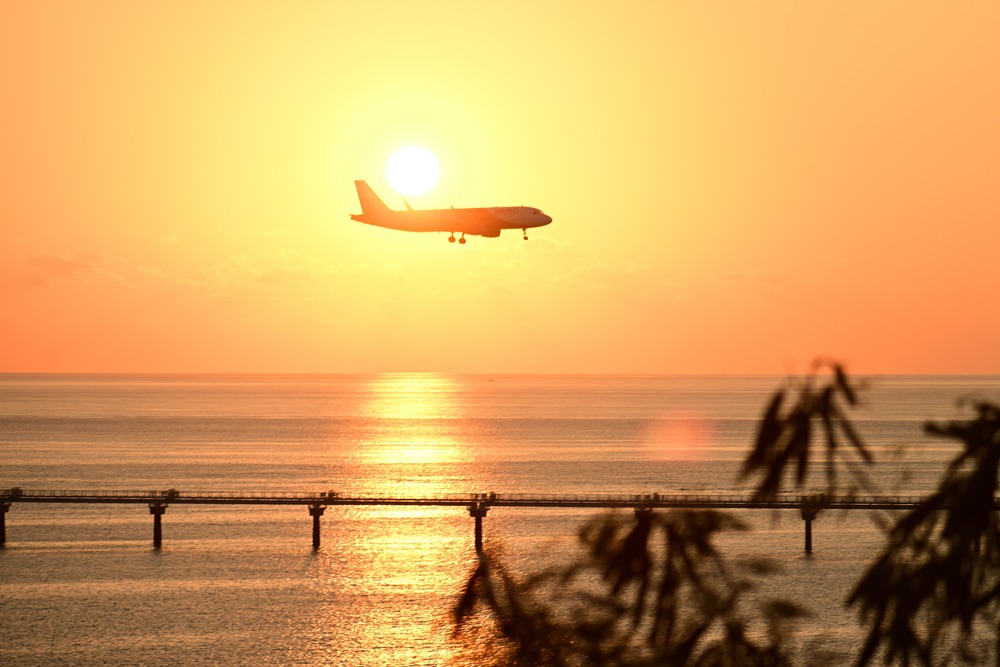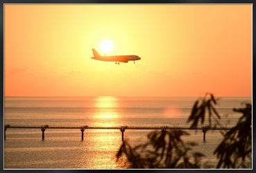 東シナ海の夕日を背景にして那覇空港第二滑走路に着陸する飛行機のシルエットは素敵です。 冬の北風時に楽しめる美です。