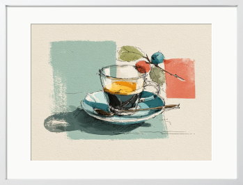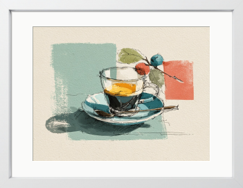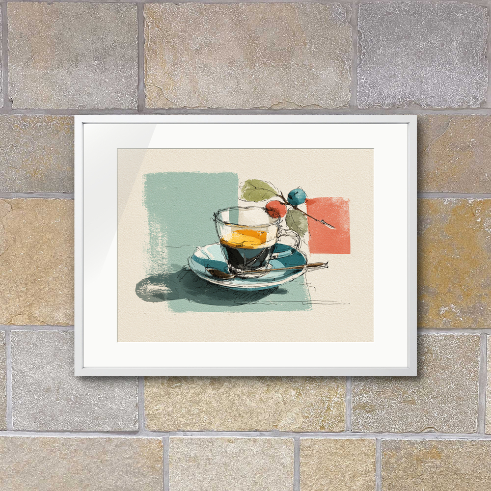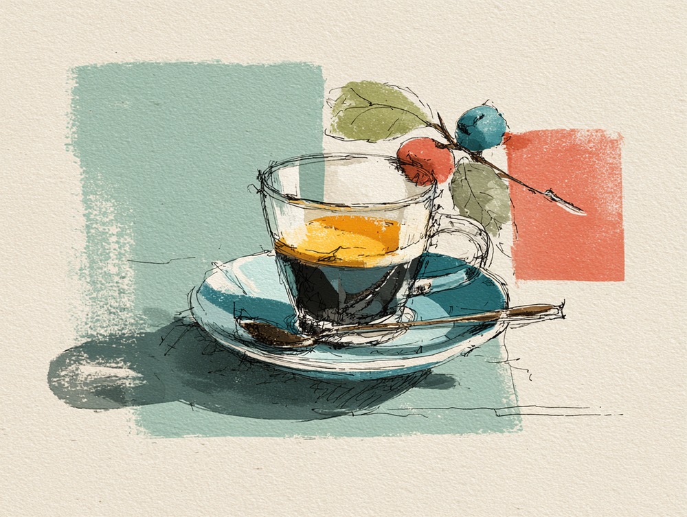 朝の光を纏う瑞々しい実りと、ガラスに注がれた一杯を軽やかに描きました。素朴な線が日常を爽やかに彩ります。