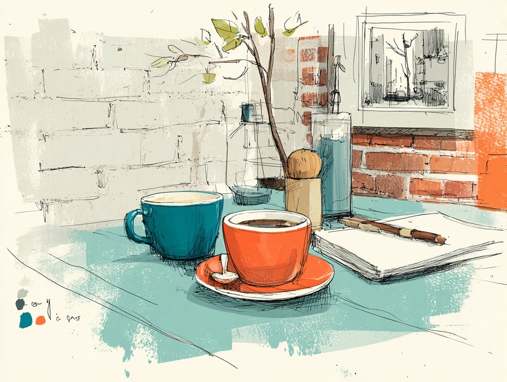 柔らかな光が差し込むカフェの片隅。ノートを広げ、対話を楽しむような穏やかな時間を軽やかに描きました。