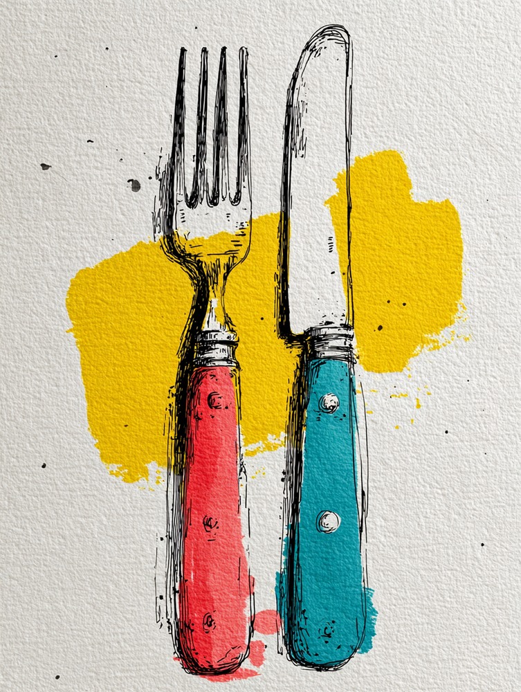 ざらりとした紙の質感に弾ける色彩。いつもの食卓を、自由でアートな雰囲気へと変えてくれるスケッチです。