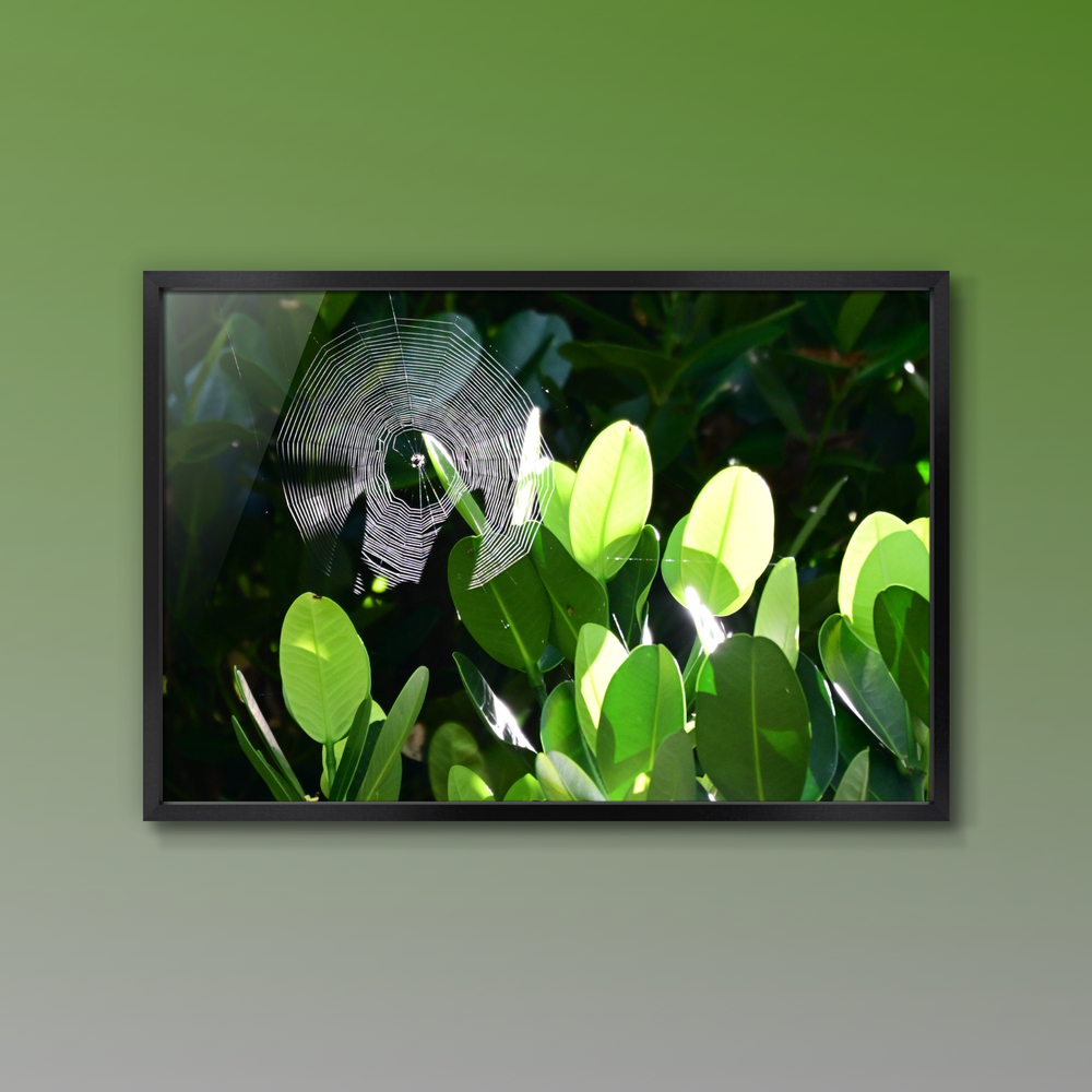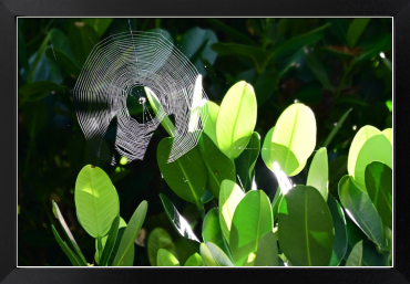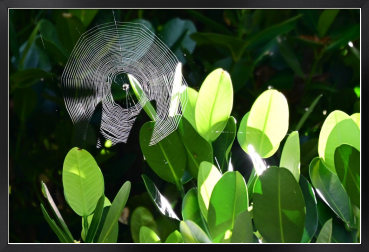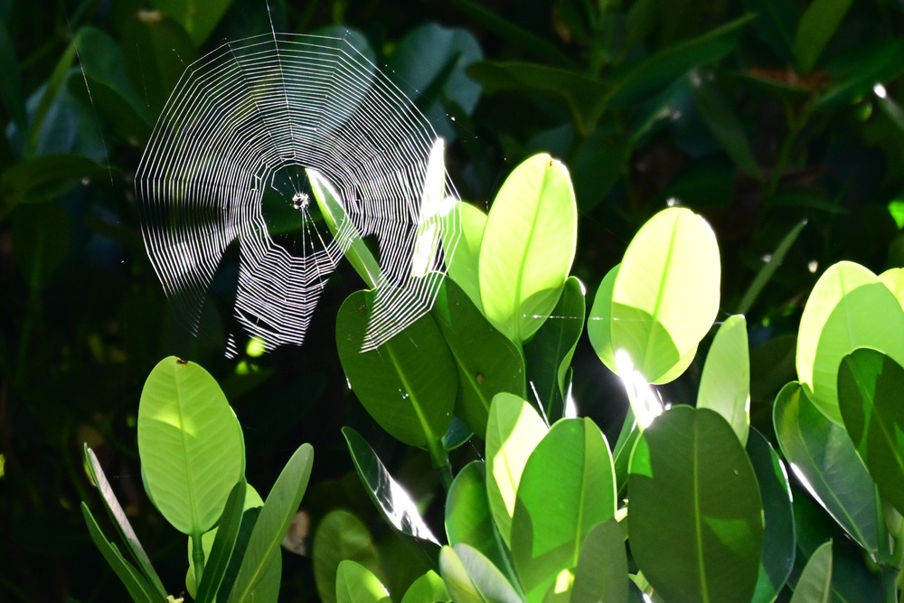 フクギの木洩れ日とクモの巣がお互いに引き立て合う印象でした