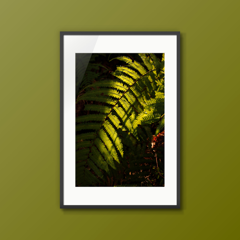 森のなかで見つけた、ふとした瞬間の美しさ。 深い緑に差し込む鋭い日差しと、それによって浮き彫りになるシダの葉のシルエットに惹かれました。 葉の一枚一枚に宿る質感を大切に閉じ込めました。 暮らしの風景の一部として、ありふれた景色のなかに潜む美しさを探求するシリーズ。 あなたの空間に、確かな存在感を放つ物語を添える一枚になれば幸いです。