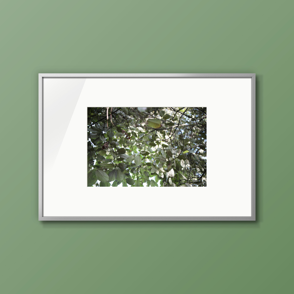 重なり合う葉の隙間から、優しく差し込む木漏れ日。 その一瞬として同じ形に留まらない光の粒と、葉が織りなす繊細なテクスチャーに惹かれました。 写真ならではの解像感で切り取られた緑のグラデーションは、 抽象絵画のように、空間に瑞々しい息吹と、心地よい奥行きをもたらします。 暮らしの風景の一部として、 ありふれた景色のなかに潜む美しさを探求するシリーズ。 あなたの空間に、清らかな物語を添える一枚になれば幸いです。