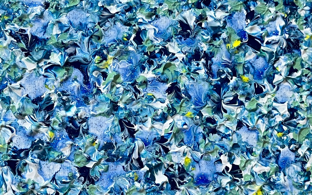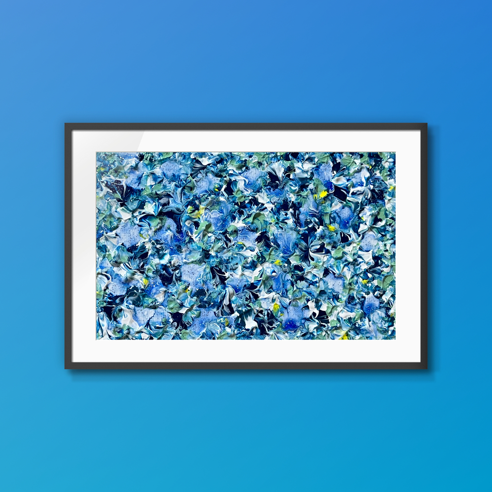 This healing abstract painting features delicate layers of refreshing blues, with graceful floral patterns gently overlapping like petals drifting in a serene garden. The cool, elegant blue tones create an atmosphere of timeless cleanliness and grace that never fades with the seasons. Gaze at it, and you’ll feel your breathing deepen and tension melt away. A perfect piece of “heart medicine” for your living space—bringing calm and pure comfort whenever daily fatigue sets in.