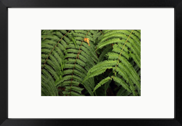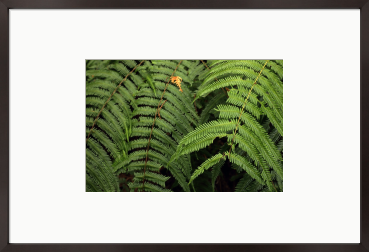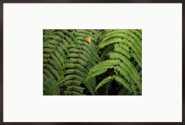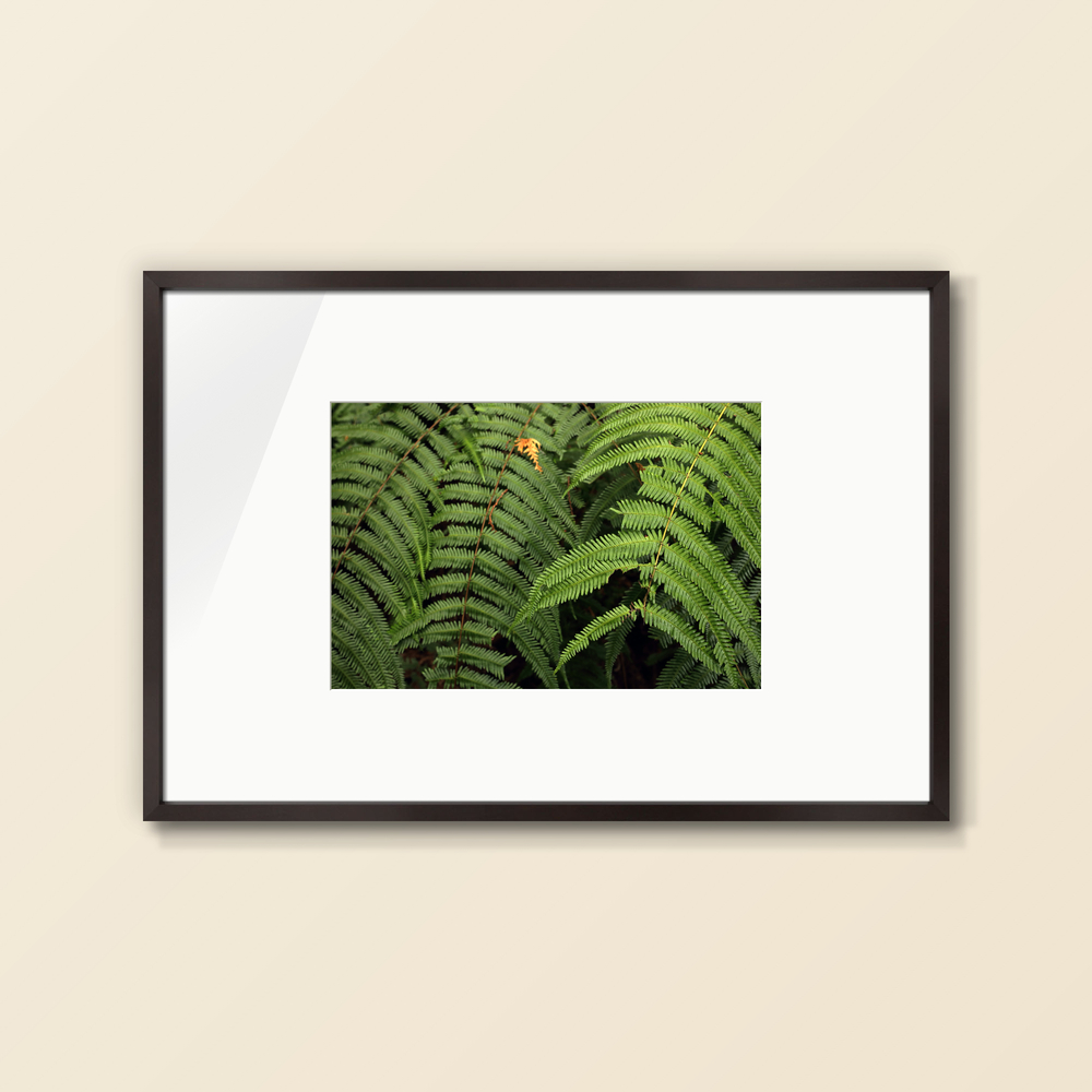 重なり合うシダの葉が作る、リズムのある造形を捉えました。 光を浴びて浮かび上がる鮮やかな緑と、重なりが生む深い影。 その幾何学的な美しさは、木製家具や観葉植物のある空間に自然に溶け込み、壁面に爽やかな奥行きをもたらします。