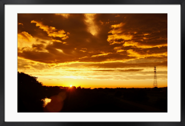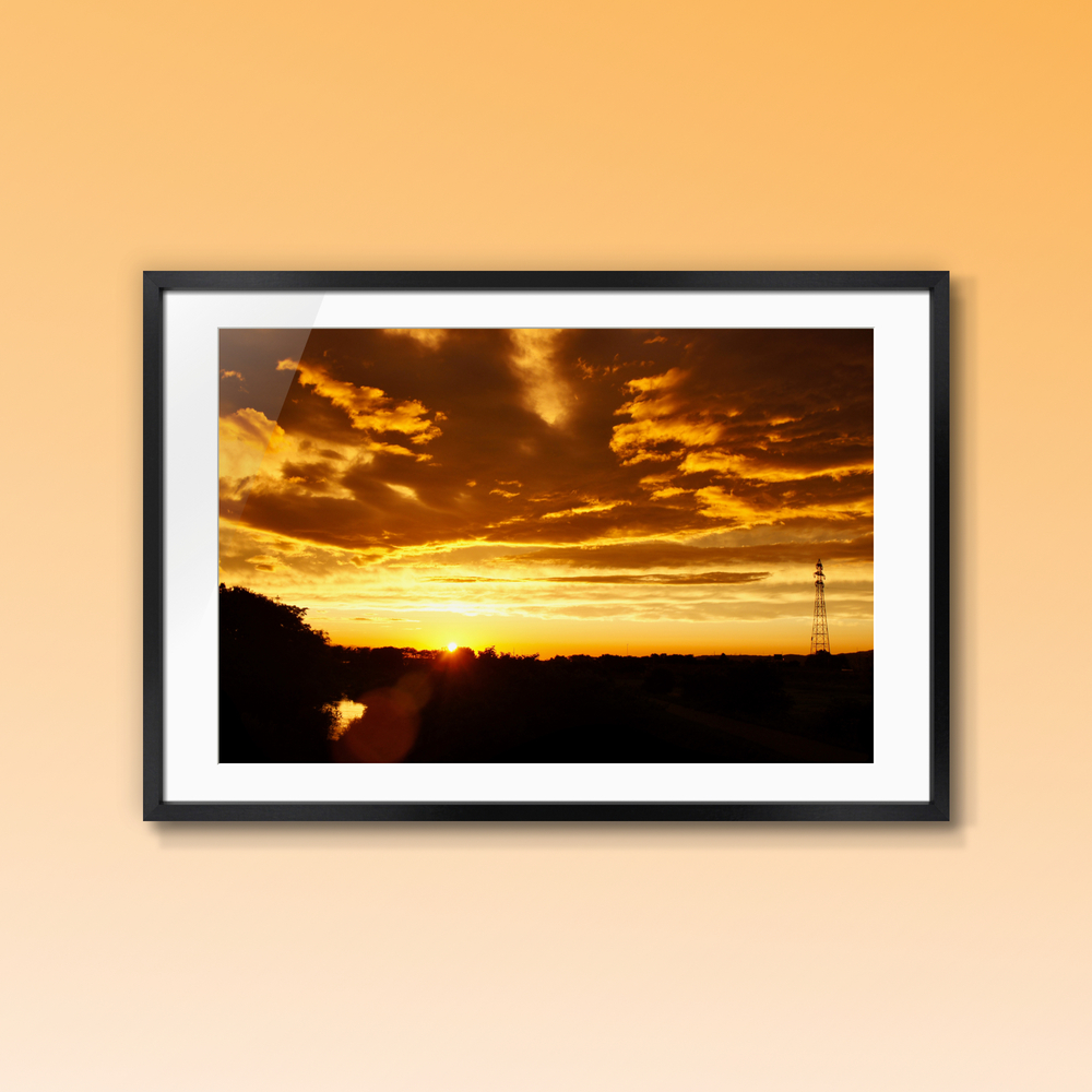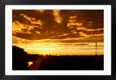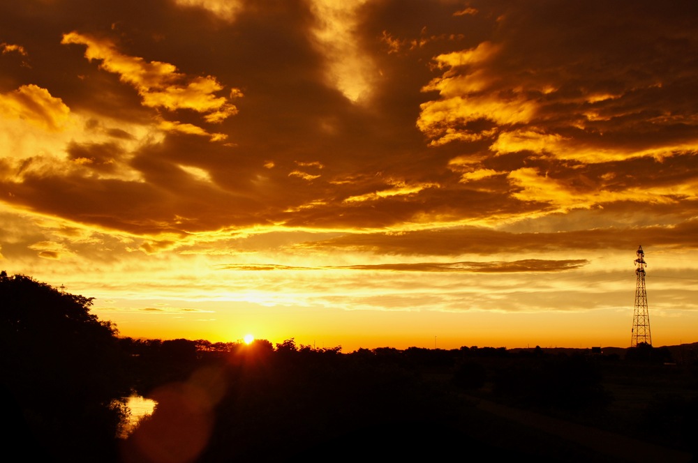 夏の日本海に沈む太陽の光に反射する小さな川の水面