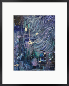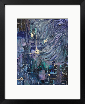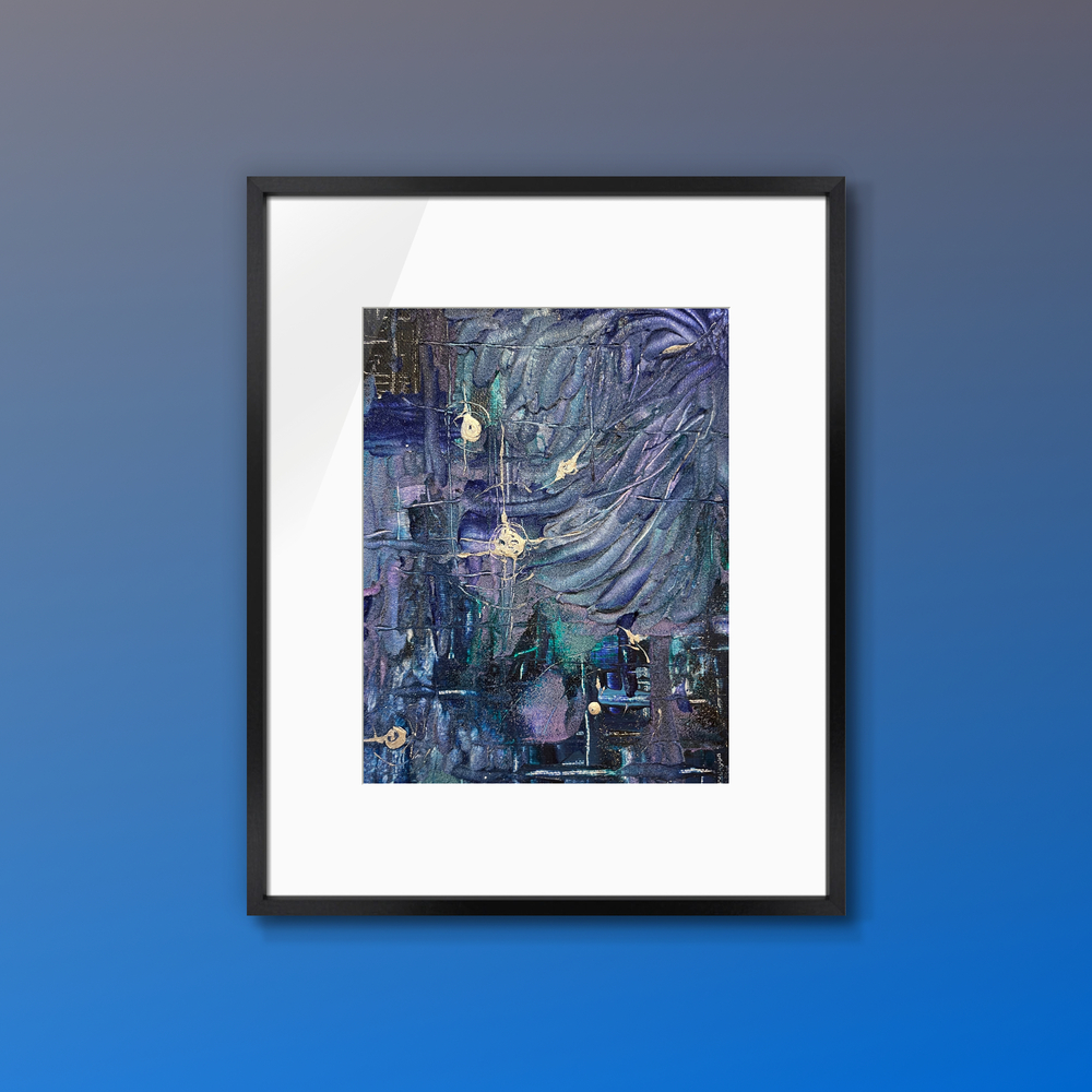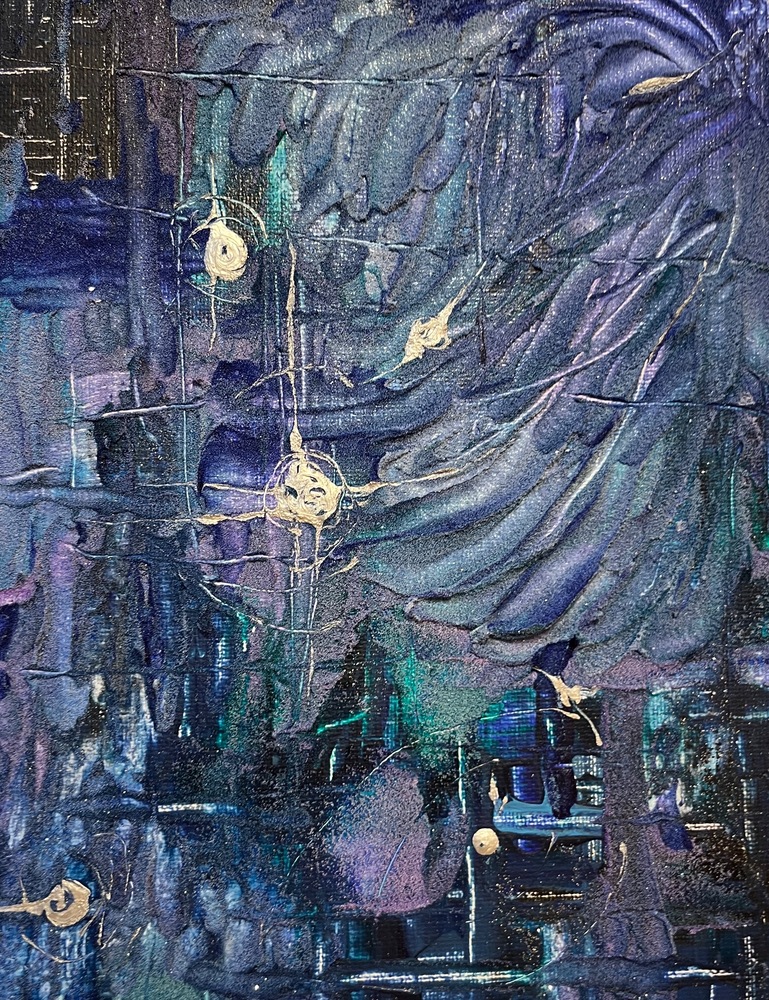 A mysterious abstract acrylic painting that gently guides you into a deep indigo vortex. Swirling layers of rich indigo and midnight blue form a powerful yet calm vortex, with subtle golden and white sparks rising like infinite possibilities. This healing masterpiece softly dissolves inner limitation, awakening quiet excitement, unlimited potential, profound calm, and a gentle sense of adventurous serenity.