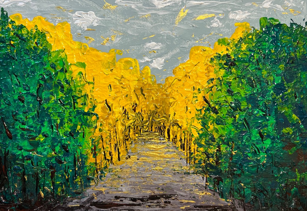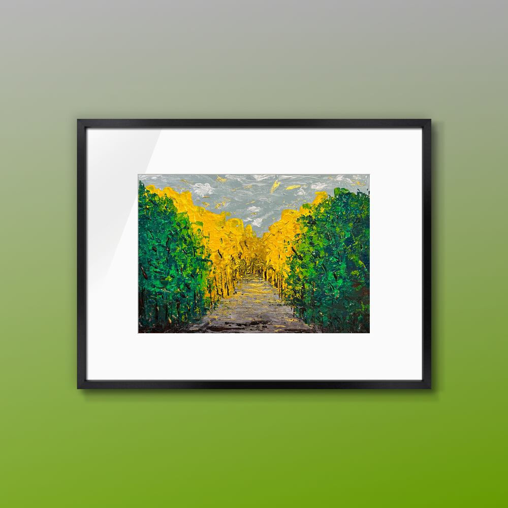 This abstract painting captures a fantastical “Verdant Portal” — where vibrant greens and warm earth tones gently overlap like an inviting gateway lined with trees. It softly leads the heart from daily chaos into a quiet, mystical world of nature, offering a sense of renewal and deep tranquility. Placing it in your room creates an eternal green portal that brings peaceful escape, inner reflection, and the gentle breath of nature anytime you need it.