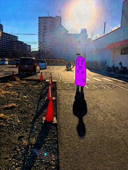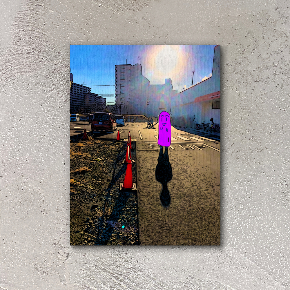 私は「気楽に今を楽しむ」をコンセプトに各地に赴いて人が写り込んだ風景を撮り、その実際の写真を絵画風にしてキャラクター(焦喰)を被せて観光絵画を制作しています。観光や散歩や迷走が好きなので、その瞬間を気楽に楽しんだ気持ちを伝えられたらと思います。制作過程で一番こだわっているのは観光や迷走を義務感なくしっかり楽しむことです。