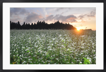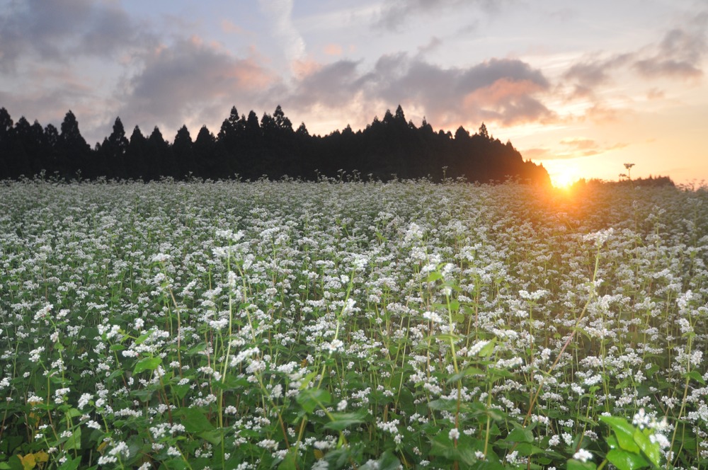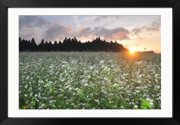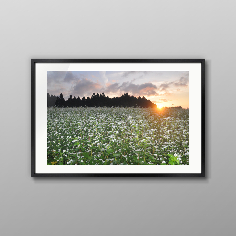 山あいの静寂の中、一面に広がるそばの花が夕日に照らされ、まるで光る海のように波打っています。 空が刻一刻と表情を変えるマジックアワー。 白く可憐な花々と、シルエットとなった山の木々、そして雲を染める茜色のコントラストが、見る人の心に懐かしさと安らぎを届けます。 一日の始まり(あるいは終わり)を告げる優しい光を、日常の風景に添えてみませんか。